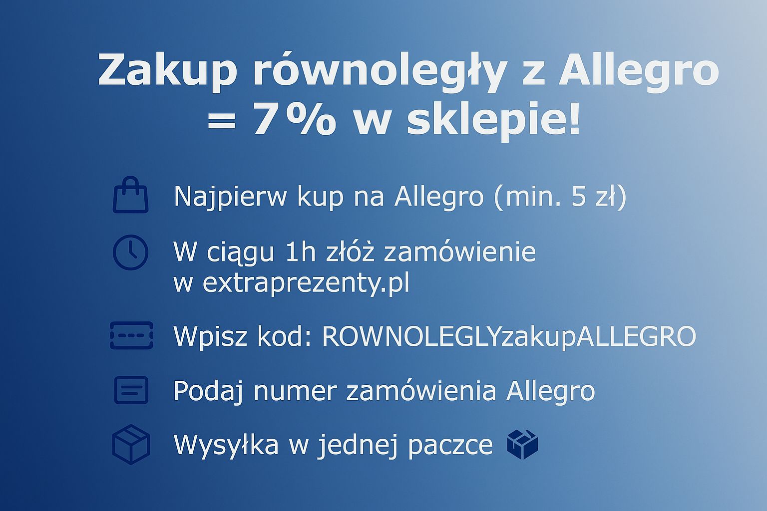 Promocja „Zakup równoległy z Allegro” polega na możliwości uzyskania dodatkowego rabatu w wysokości 7% na zakupy dokonane w sklepie internetowym mywdomu.pl - extraprezenty.pl, przy równoczesnym złożeniu zamówienia w serwisie Allegro (sprzedawca: extraprezenty_pl)
