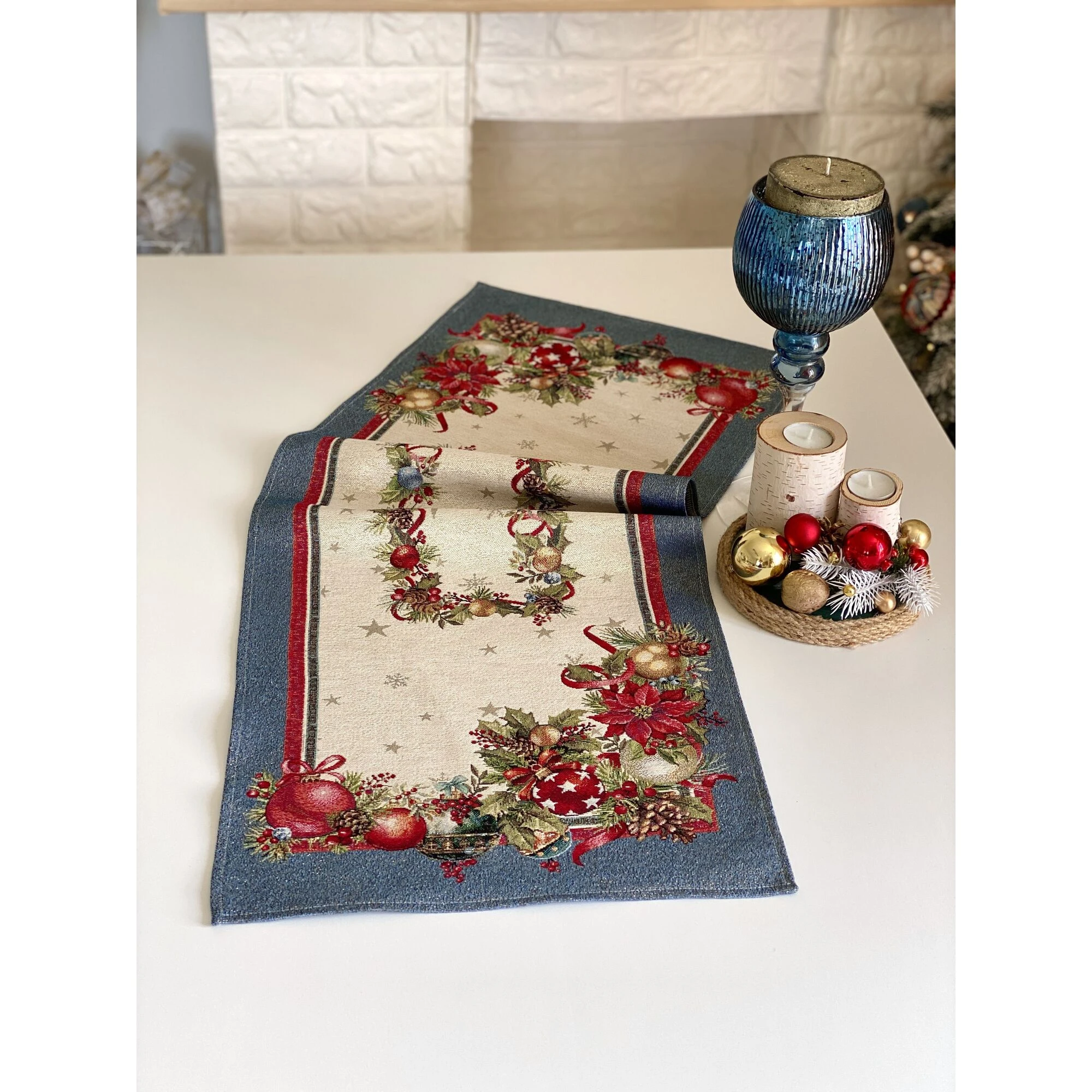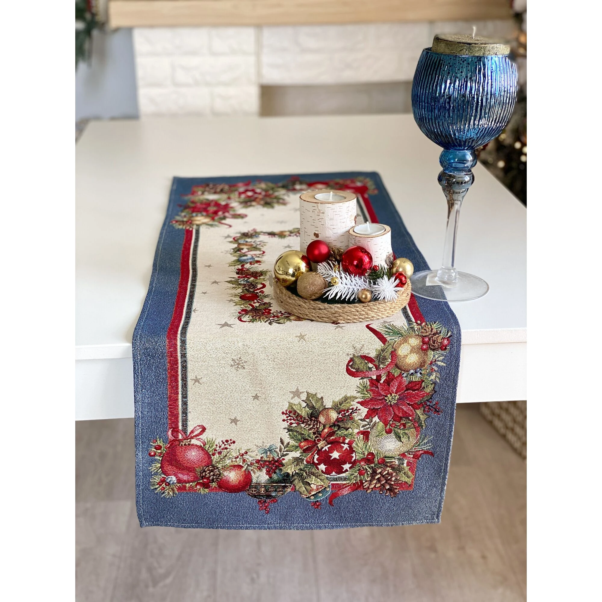 Bieżnik bożonarodzeniowy (o wymiarach = około 45x140cm) z tkaniny gobelinowej tkany maszynowo (to nie nadruk!!!) to elegancki i praktyczny sposób, aby w kilka chwil nadać stołowi wyjątkowy, świąteczny charakter. Rozłożony na stole lub ławie podkreśla atmosferę Świąt i sprawia, że nawet najprostsza aranżacja nabiera odświętnego blasku. To ten element dekoracji, który warto mieć choćby na kilka dni w roku – bo właśnie wtedy tworzy niezastąpiony klimat.