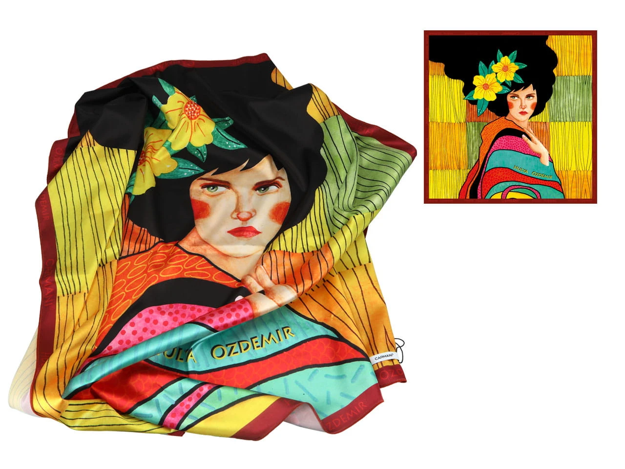 Kwadratowa, kolorowa chusta z motywem inspirowanym twórczością Hulyi Ozdemir* firmowana marką Carmani wykonany z innowacyjnej tkaniny zwanej "taminą szlachetną"