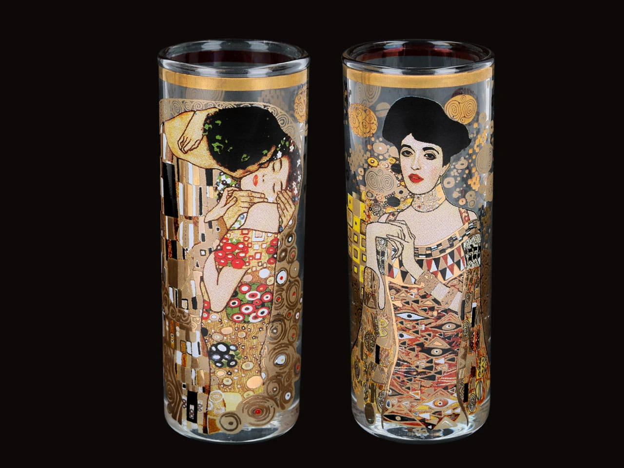 Kieliszki do wódki z naniesionym na powierzchni ładnym i popularnym motywem inspirowanym malarstwem Gustava Klimta.