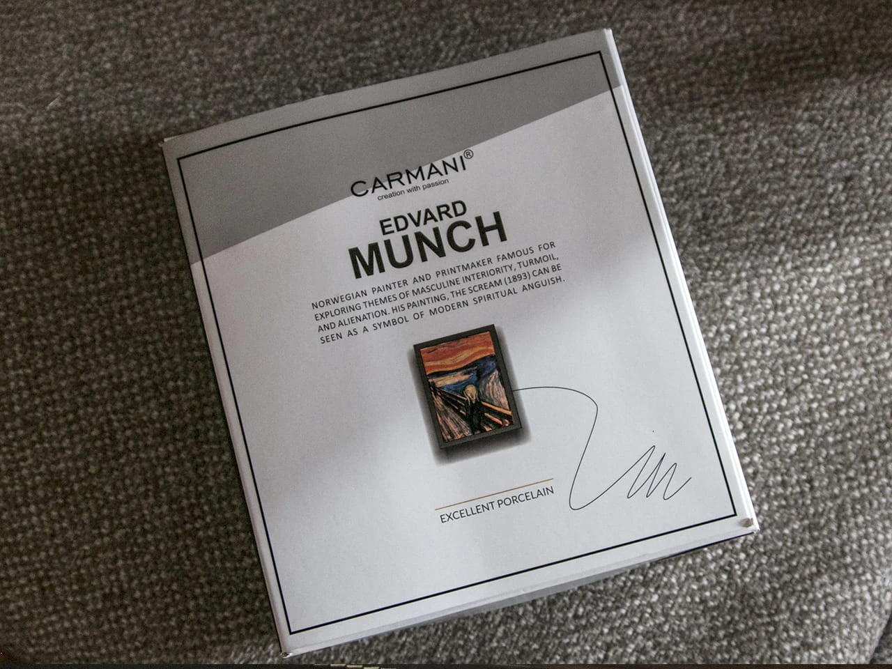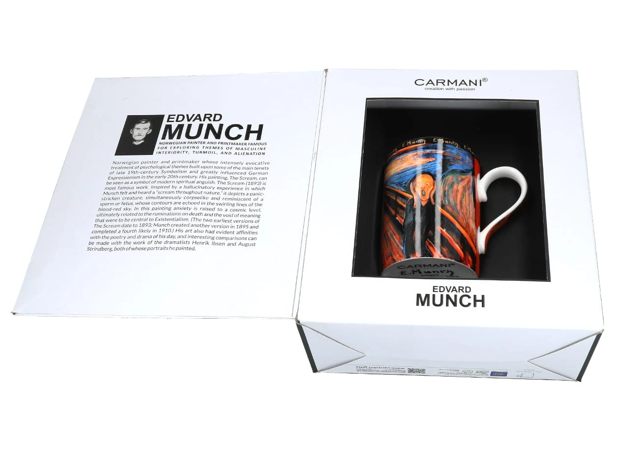 Jesteś miłośnikiem malarstwa, ekspresjonizmu... kubek Edvard Munch - Krzyk wykonany z bardzo dobrej jakości, białej i połyskującej porcelany kostnej firmowanej znaną oraz cenioną marką Carmani wywodzącą się z Nowej Zelandii i Australii, a mającą swoje początki w latach 90-tych XX-wieku.