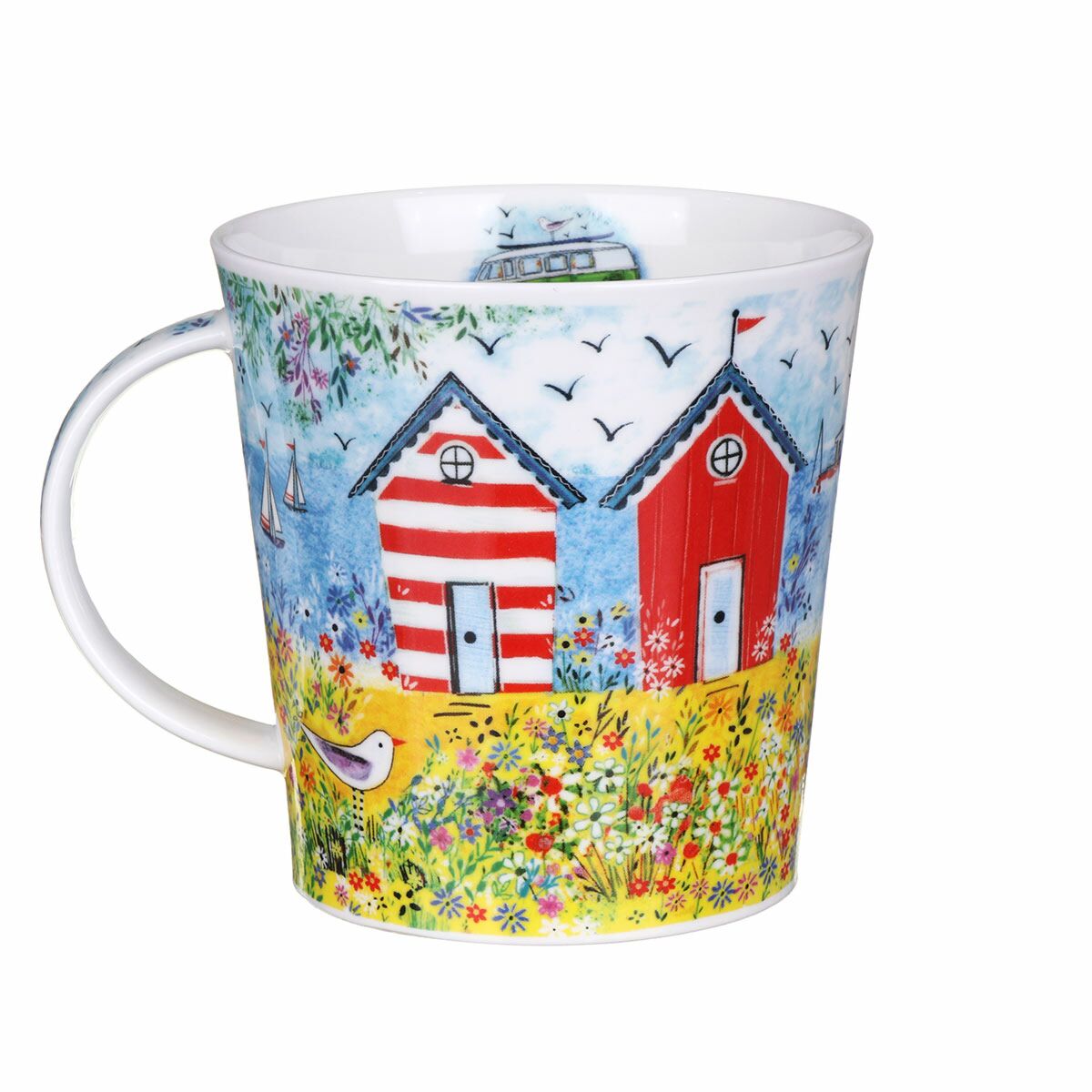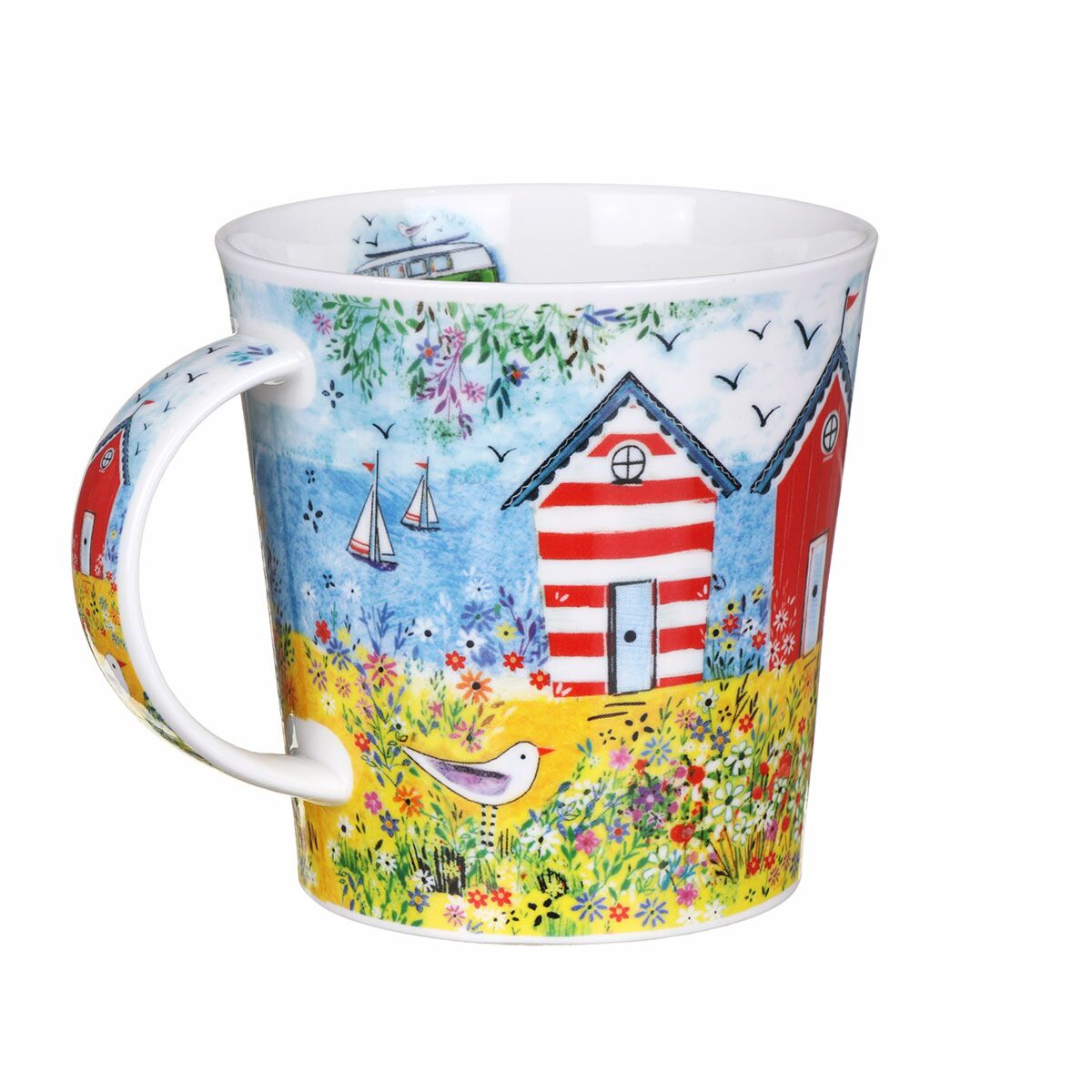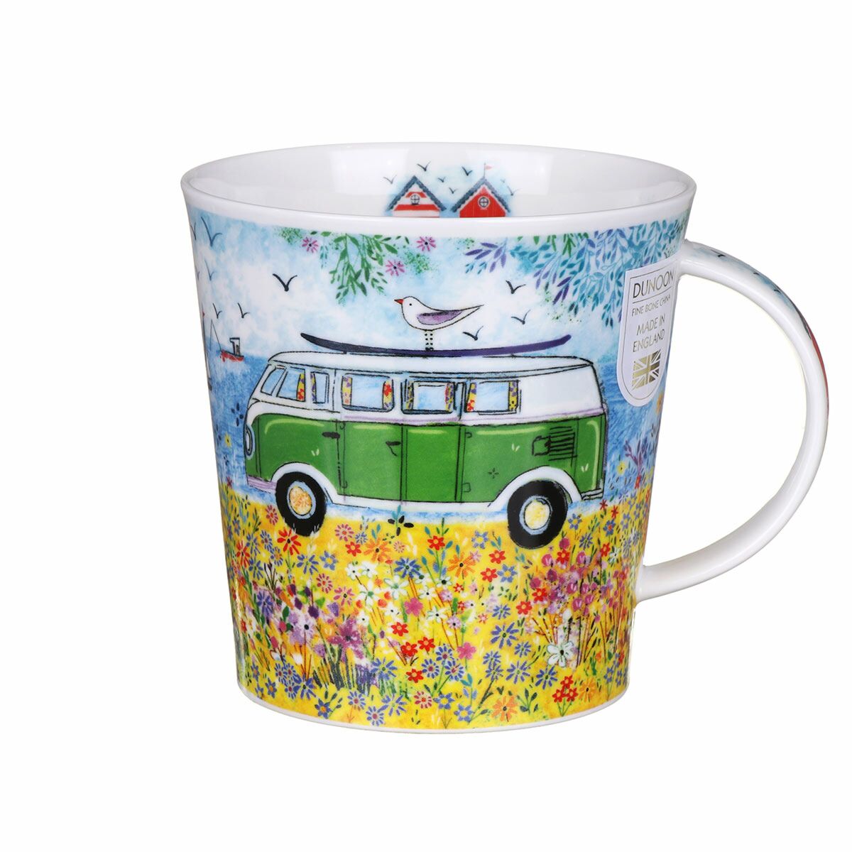 Akwarelopodobny, wyraźny i kolorowy motyw Cool Campers Green idealny jako wspomnienie lata znad morza autorstwa brytyjskiej artystki-grafika Clare Tupper, a naniesiony na dużym, prawie półlitrowym kubku Cairngorm