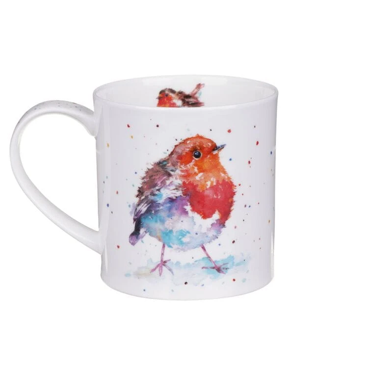 Namalowana delikatnymi pociągnięciami pędzla akwarela z ptakiem-rudzikiem autorstwa angielskiego ilustratora Harrisona Ripley'a naniesiona na kubek Orkney tworząc motyw Fluffy Feathers Robin