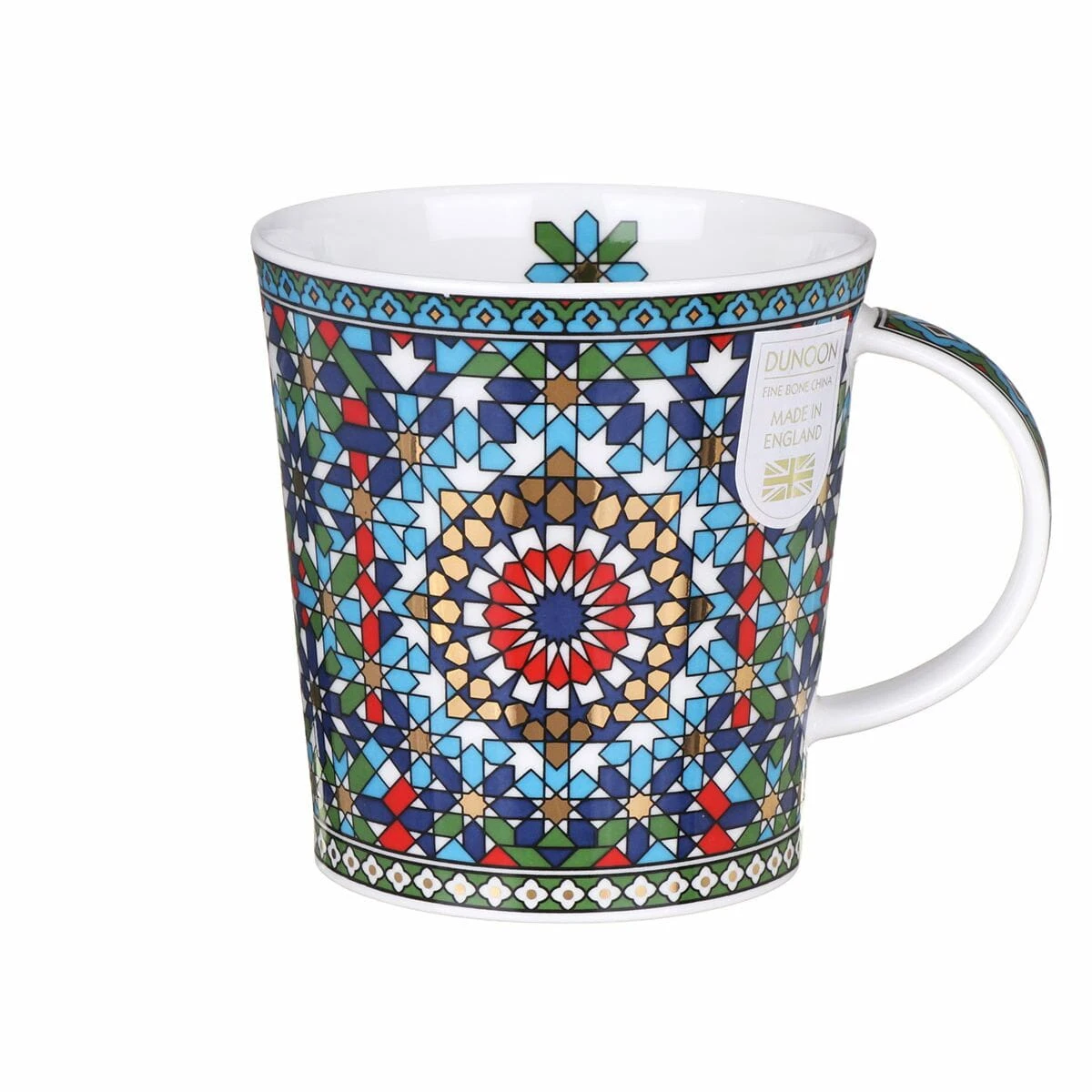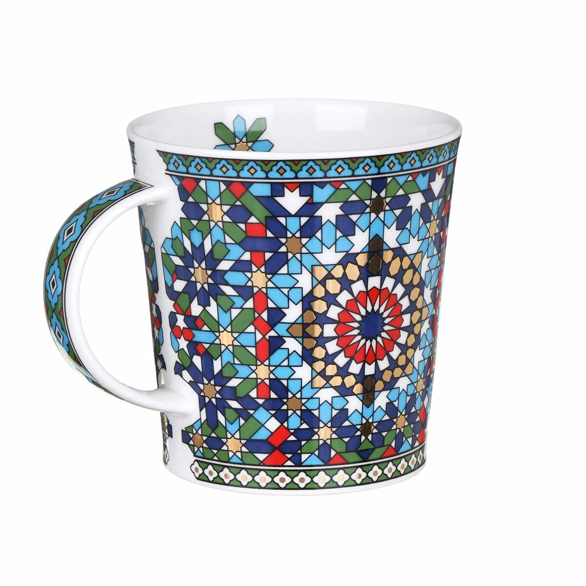 Kubek Tangier Green o bardzo ładnym motywie ze zdobieniami wykonanymi 22k złotem inspirowanym marokańskimi tekstyliami, a naniesionym na kubku wchodzącym w skład kolekcji kubków Lomond charakteryzującymi się elegancką prostotą, wygodą i ergonomią kształtu.