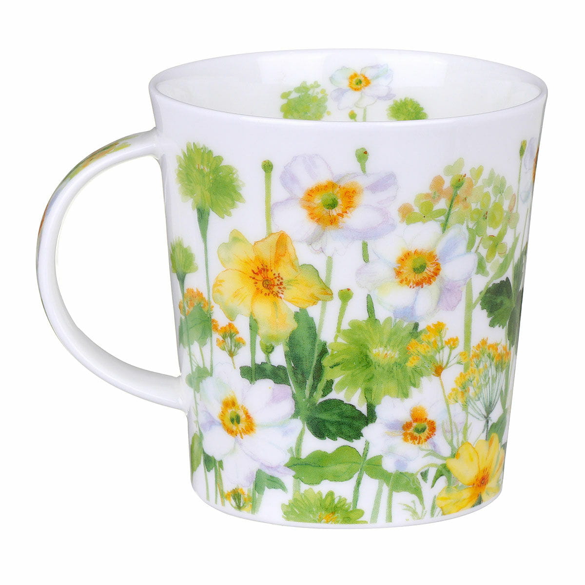 Akwarelopodobny, kwiatowy, w odcieniach białego, żółtego i zielonego koloru to motyw kubka Lomond - Flower Garden White autorstwa brytyjskiej artystki-grafika Claire Winteringham.