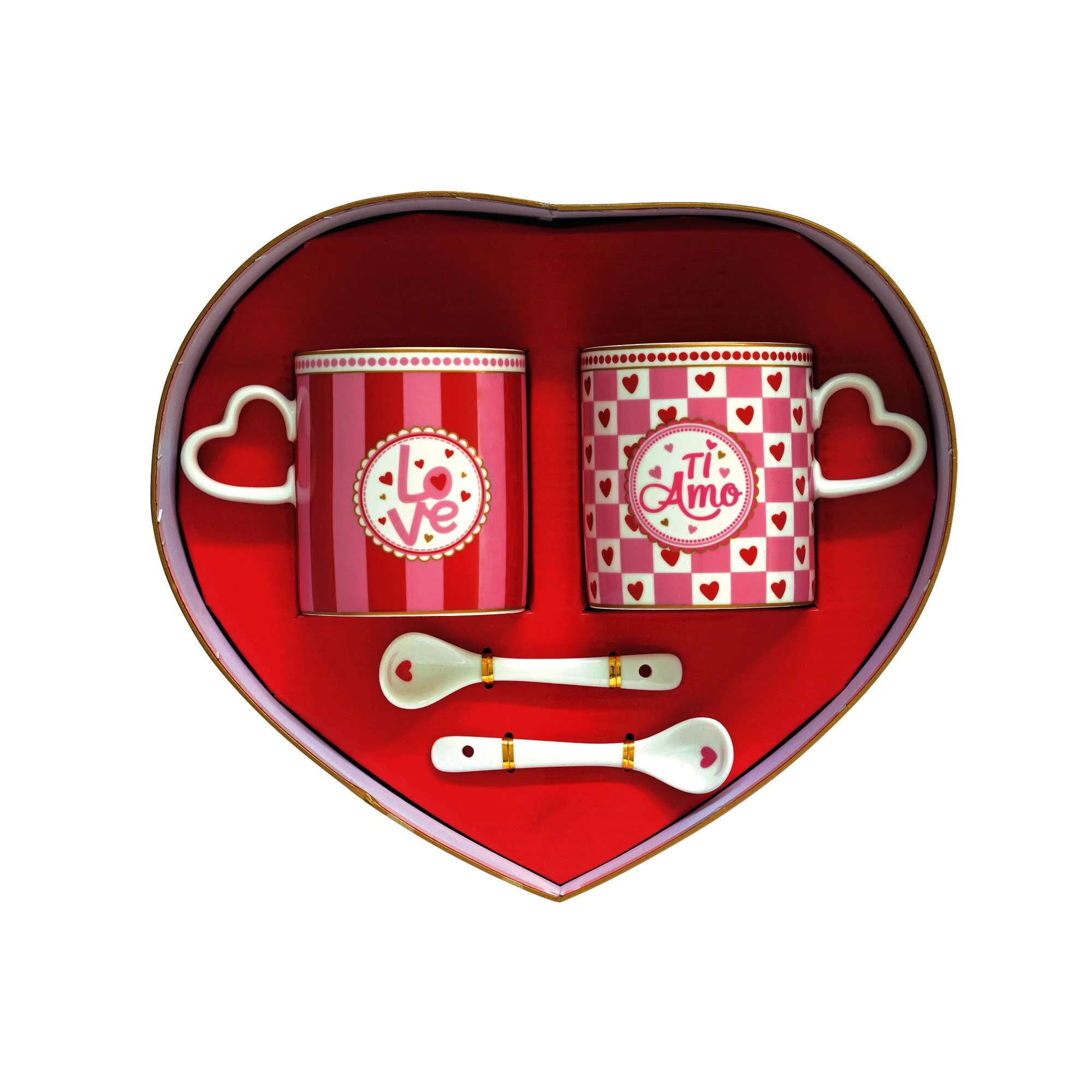 Zestaw dwóch porcelanowych kubków o prostym kształcie z łyżeczkami to urocza propozycja dla par, które lubią dzielić codzienne chwile przy kawie lub herbacie. Uchwyty w kształcie serca oraz napisy „"Love" i "Ti amo" wprowadzają romantyczny, walentynkowy klimat. To idealne kubki na poranne napoje, wieczorną herbatę albo wspólną kawę po kolacji. Dołączone łyżeczki z motywem serca tworzą spójny, estetyczny komplet. Świetny pomysł na drobny prezent, który jest jednocześnie praktyczny i symboliczny.