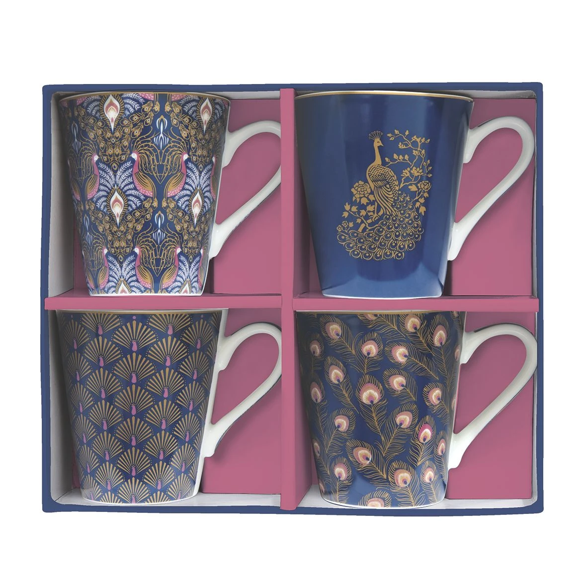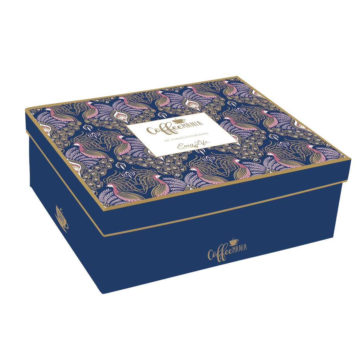 Komplet CoffeeMANIA/Atmosphere składający się z czterech porcelanowych kubków(300ml) o rozszerzającym się ku górze kształcie i różnych, oryginalnych motywach inspirowanych... ptakiem-pawiem.