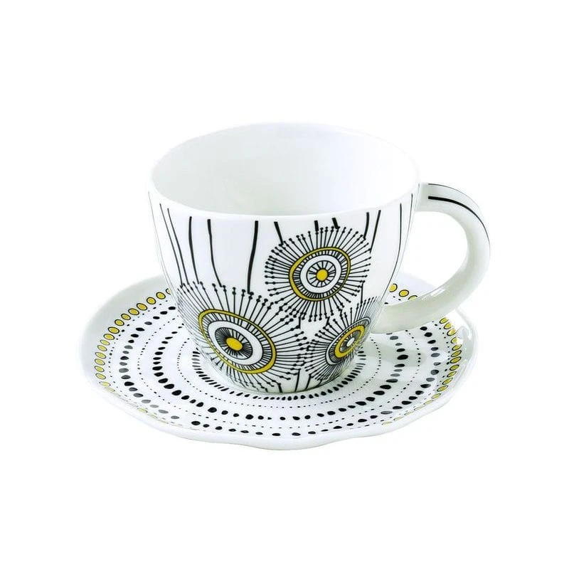Poręczna, uniwersalna filiżanka(około 280ml) ze spodkiem z kolekcji Organic charakteryzującej się niesymetrycznymi kształtami z wytłoczeniami(np.: ręcznie formowane filiżanki i kubki a'la "gnieciuch") i oryginalnym, wyraźnym motywem inspirowanymi afrykańskimi materiałami włókienniczymi.