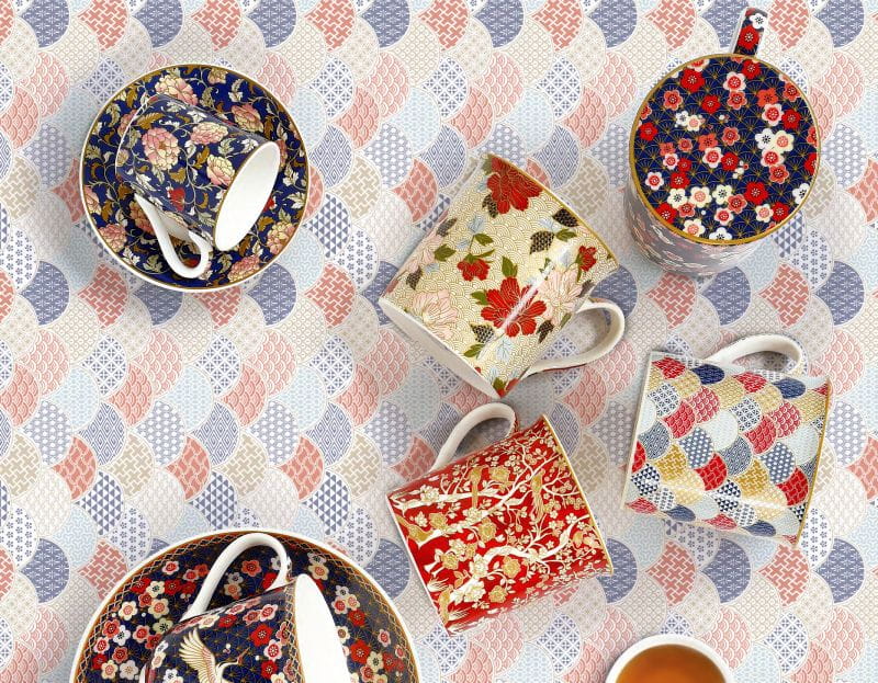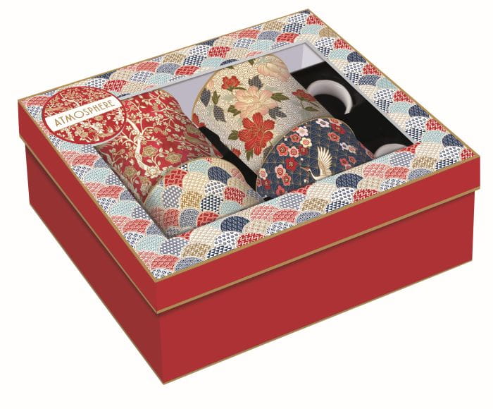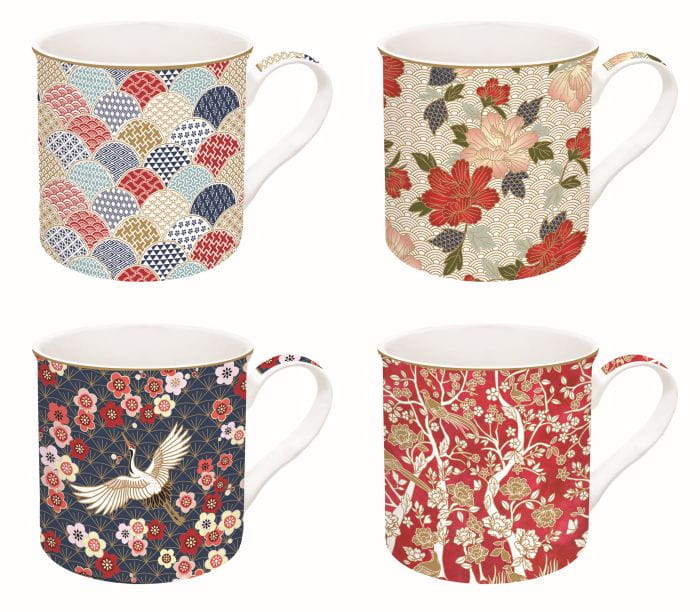 Komplet Atmosphere składający się z czterech, różnych, porcelanowych kubków(300ml) o ładnych, nietypowych motywach inspirowanych oryginalnymi tekstyliami z różnych zakątków Świata.