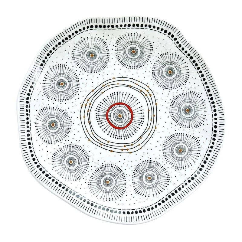 Porcelanowy półmisek(średnica = do około 30cm) wchodzący w skład niekonwencjonalnej i nieco awangardowej kolekcji Organic charakteryzującej się niesymetrycznymi kształtami z wytłoczeniami(ręcznie formowane talerzyki, filiżanki i kubki a'la "gnieciuch") oraz oryginalnym, wyraźnym motywem inspirowanymi afrykańskimi materiałami włókienniczymi(wierzchnia, użytkowa powierzchnia) i nieoszlifowanym spodem.