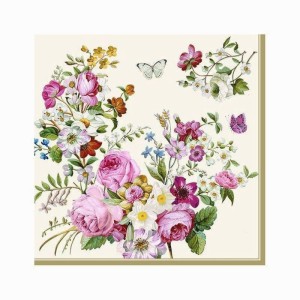 Opakowanie zawierające 20 sztuk serwetek 3-warstwowych z kolekcji "Blooming Cream" o bardzo ładnym, atrakcyjnym wizualnie motywie kwiatowym naniesionym na delikatnie kremowym tle, stworzonej przez włoski koncern "Easy Life/Nuova R2S".