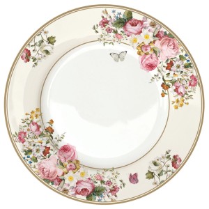 Porcelanowy talerz obiadowy(27cm), tzw. "płytki" z kolekcji Blooming Cream o bardzo ładnym, atrakcyjnym wizualnie motywie kwiatowym naniesionym na delikatnie kremowym tle, stworzonej przez włoski koncern Easy Life/Nuova R2S.