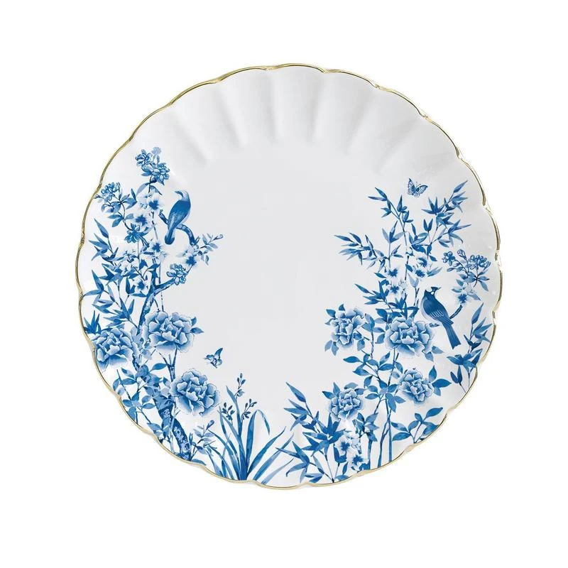 Motyw "Paradise Garden"(rajski ogród) to niezwykle finezyjny, niebieski wzór inspirowany orientem. Wśród bujnych piwonii i bambusowych liści przysiadają dwa egzotyczne ptaki – niczym strażnicy ukrytego ogrodu. Delikatne motyle dodają całości lekkości i romantyzmu, a złocone, falowane brzegi podkreślają wyrafinowany charakter porcelany.