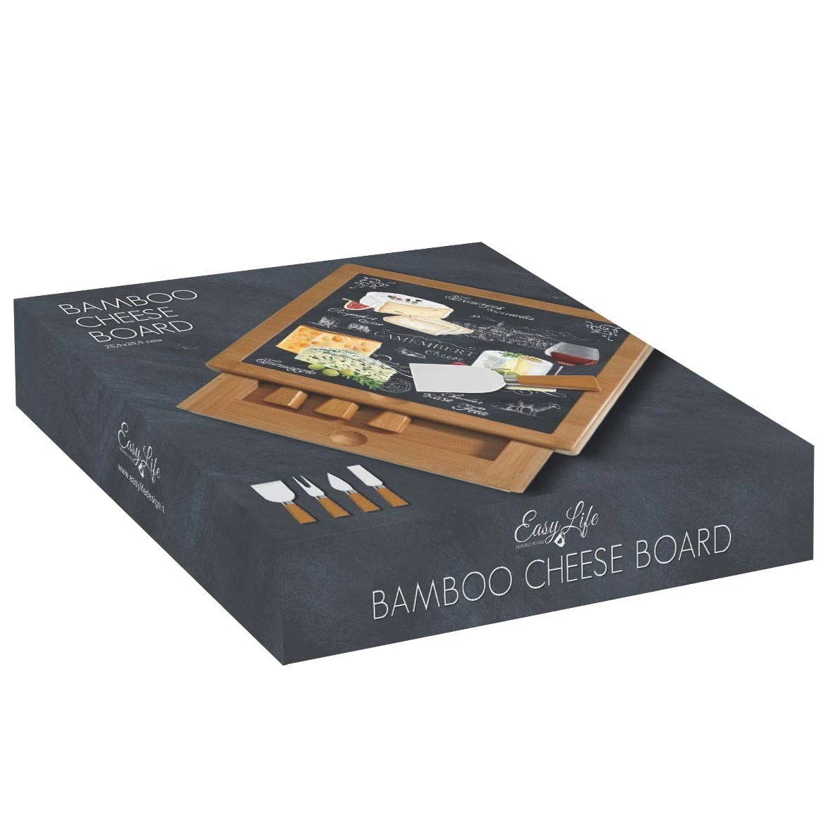 Zestaw składający się z drewnianej(bambus) tacy(około 25,5x25,5cm), z wkomponowaną szklaną deską do krojenia oraz szufladką do przechowywania czterech noży do sera, które są w komplecie z kolekcji Easy Life/Nuova R2S - World of Cheese