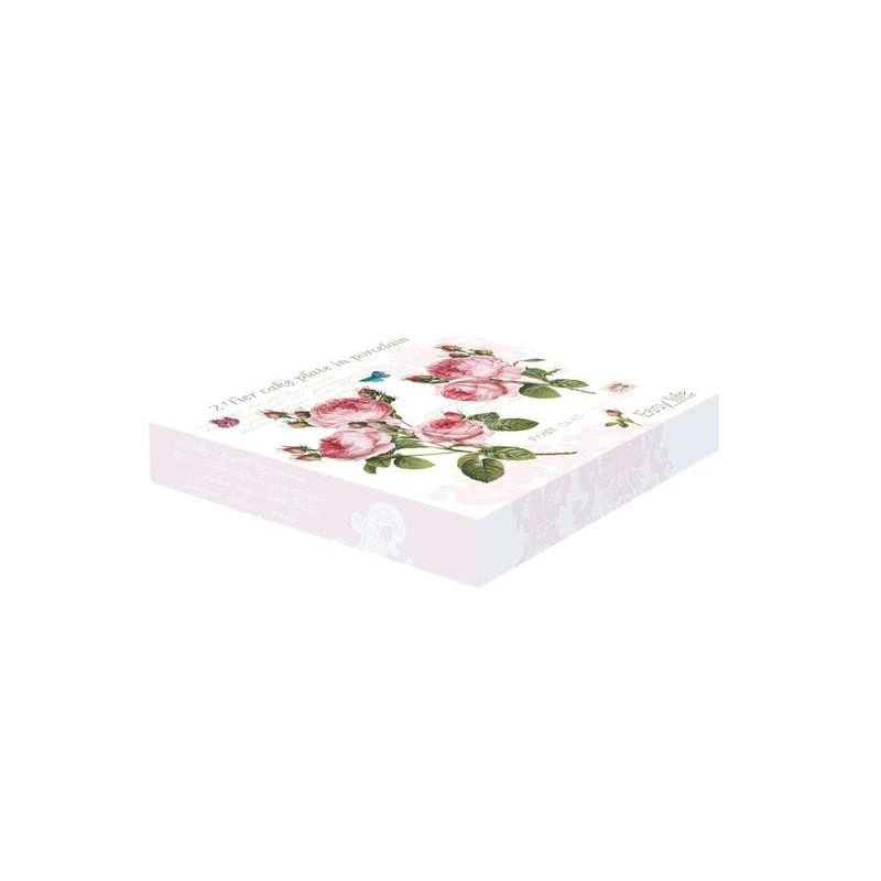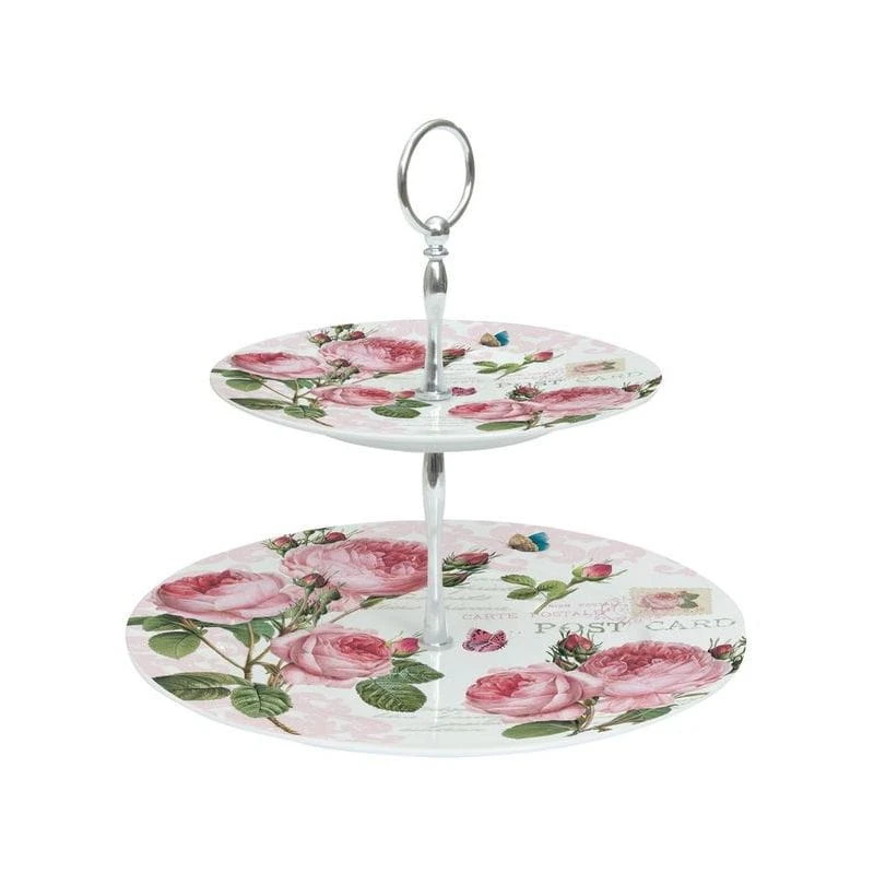 2-poziomowa patera z porcelanowymi talerzami(19/27cm) z naniesionym na powierzchni oryginalnym, bardzo ładnym motywie w róże inspirowanym papeteriami z początku XX wieku.