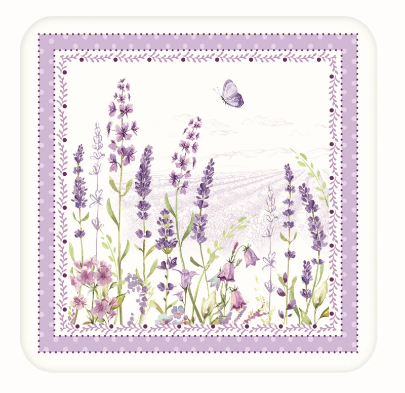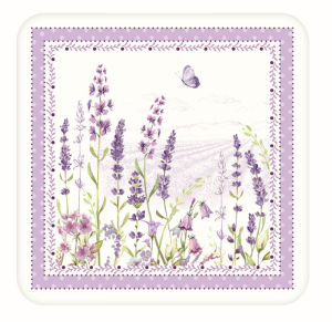 ... komplet sześciu, małych podkładek korkowych z kolekcji "Easy Life/Nuova R2S - Lavender Field"(lawendowe pole) o ładnym, popularnym motywie w rośliny/kwiaty lawendy i owady stworzonym przez utalentowaną i cenioną artystkę-grafika i ilustratorkę Dorę Papis, której obrazy oraz grafiki wykorzystywane są przez koncern "Nuova R2S" z dużym powodzeniem od wielu lat.