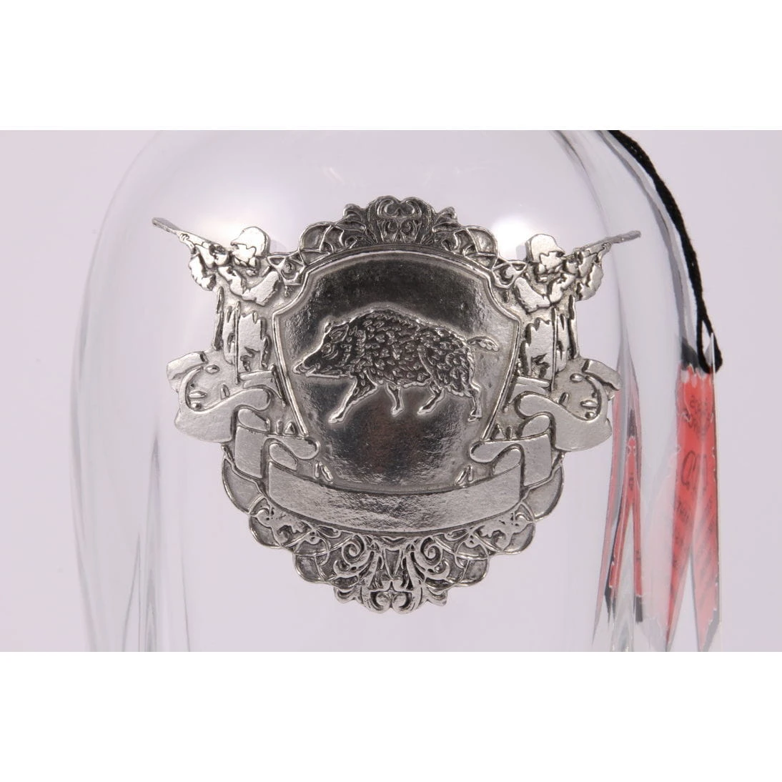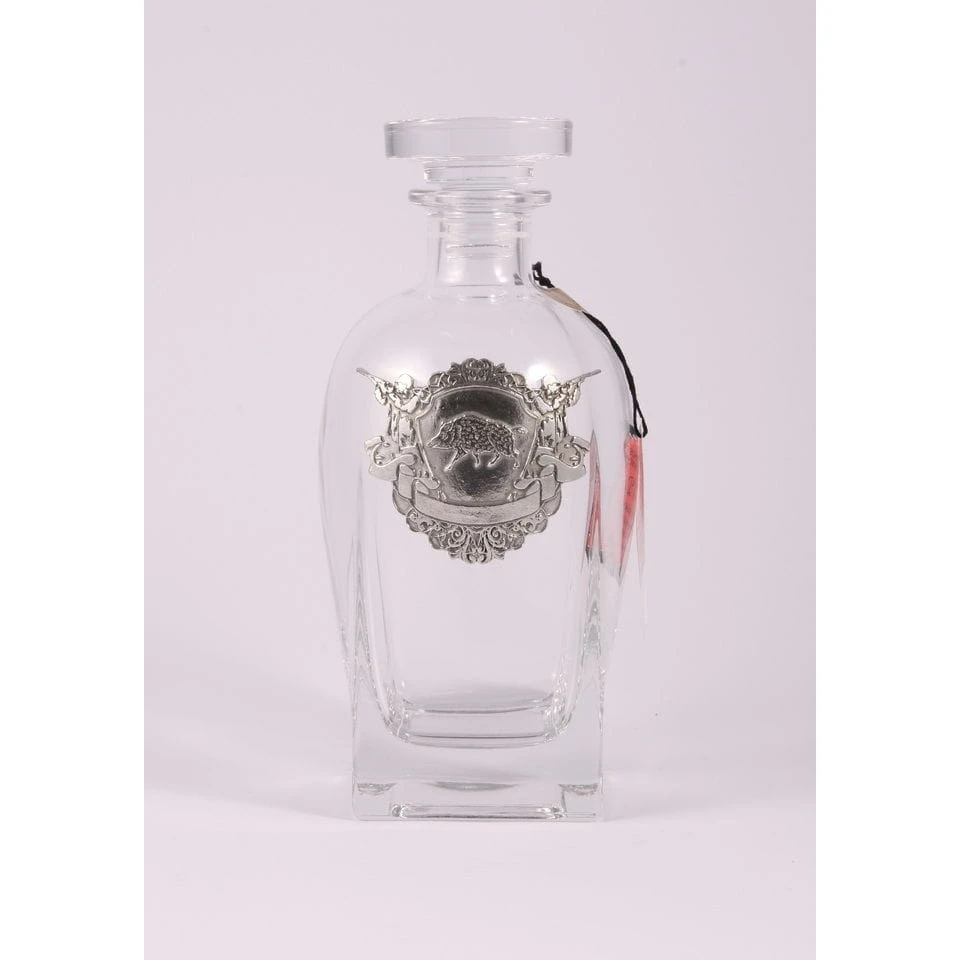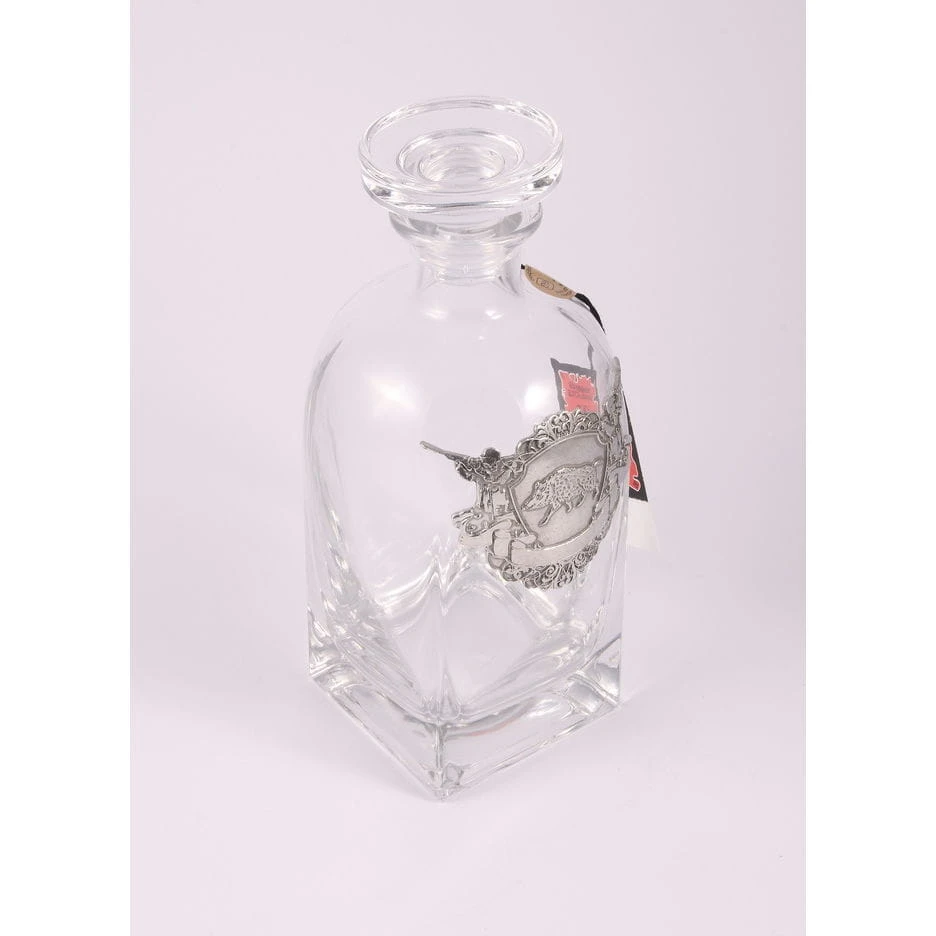 Ładna, o oryginalnym design szklana karafka 700ml ze zdobieniami(tarcza z dzikiem i myśliwymi po bokach) na szkle wykonanymi cyną, firmowana marką Freitas & Dores Unipessoal