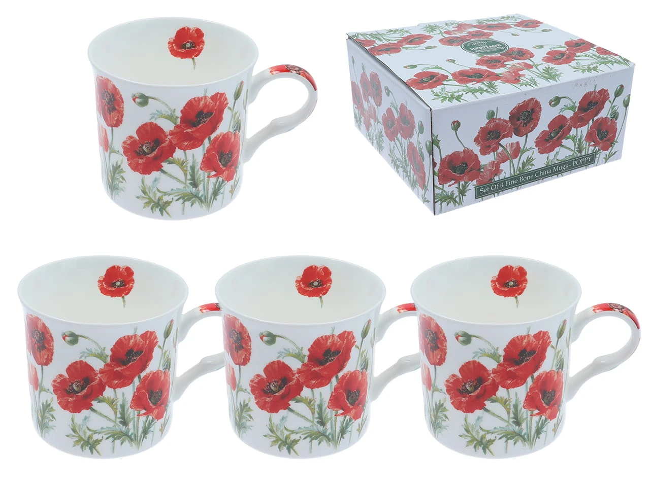 Komplet Poppy(kwiat maku/makii) składający się z czterech, poręcznych kubków(295ml) wykonanych z bardzo dobrej jakości porcelany firmowanej dawną, angielską marką Heritage mającą swoje korzenie od ponad pół wieku w słynnym z produkcji porcelany, angielskim miasteczku Stoke-on-Trent.