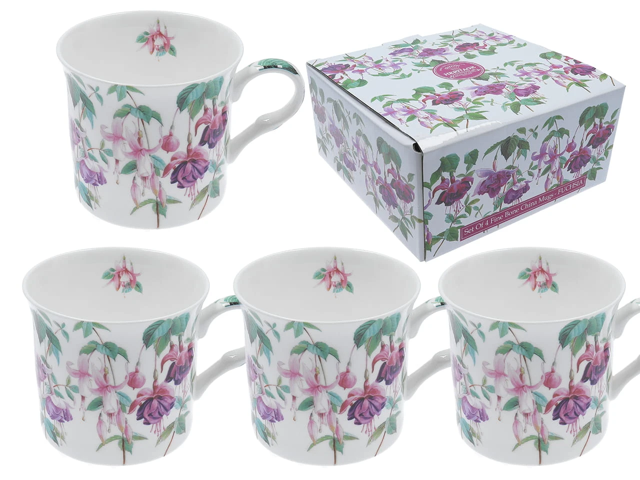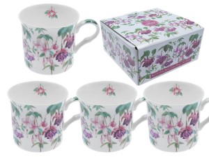 Komplet Fuchsia składający się z czterech, poręcznych kubków(295ml) wykonanych z bardzo dobrej jakości porcelany firmowanej dawną, angielską marką Heritage mającą swoje korzenie od ponad pół wieku w słynnym z produkcji porcelany, angielskim miasteczku Stoke-on-Trent.