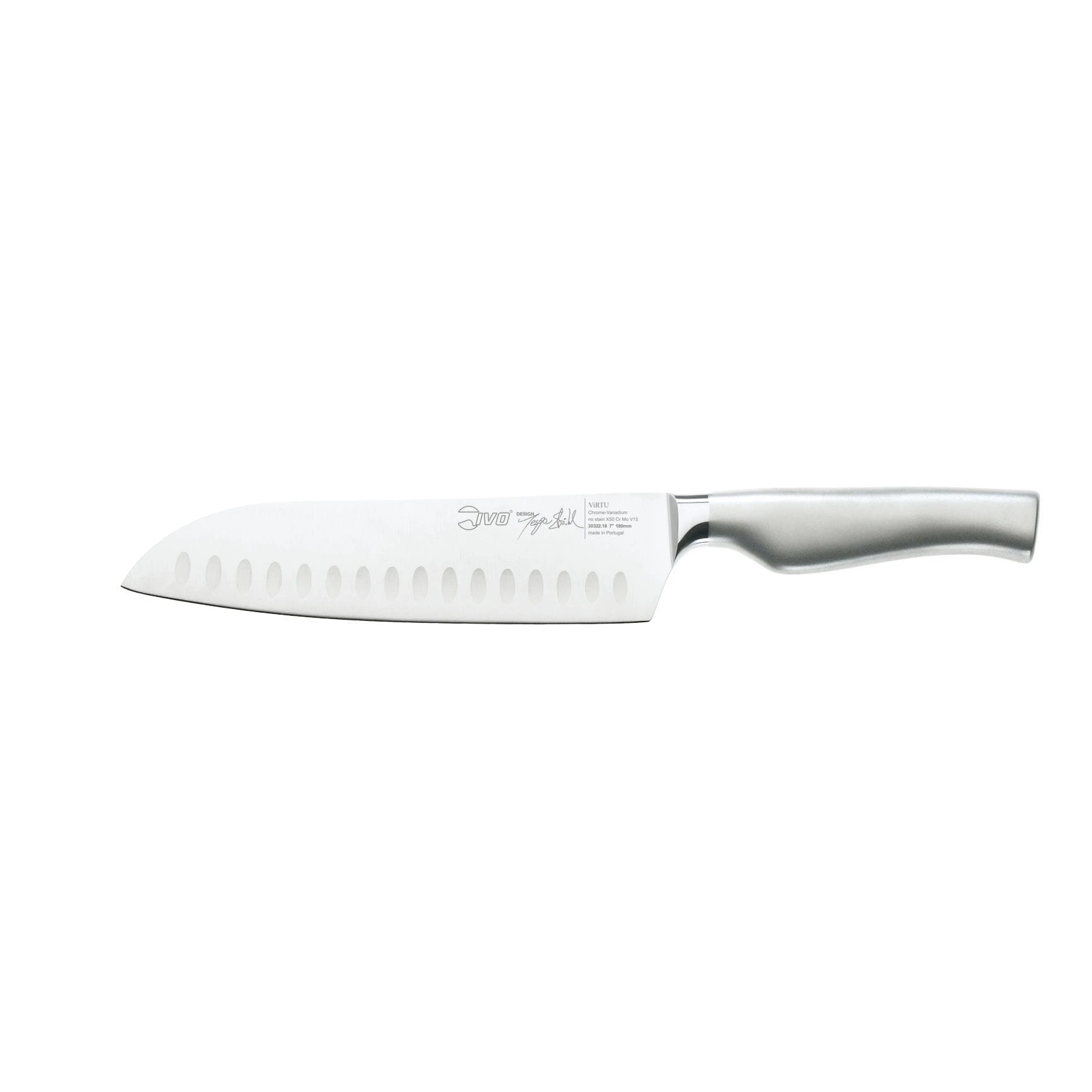 Wyprodukowany w Portugalii, profesjonalny, kuchenny nóż santoku IVO - Virtu(180mm) wykonany(tak jak i każdy inny nóż marki IVO) ze specjalnie opracowanej stali, zgodnie z rygorystycznymi normami, w której uzyskano idealną równowagę pomiędzy chromem i wanadem, co jest kluczem do wyjątkowo twardych, ostrych i odpornych na korozję narzędzi tnących.