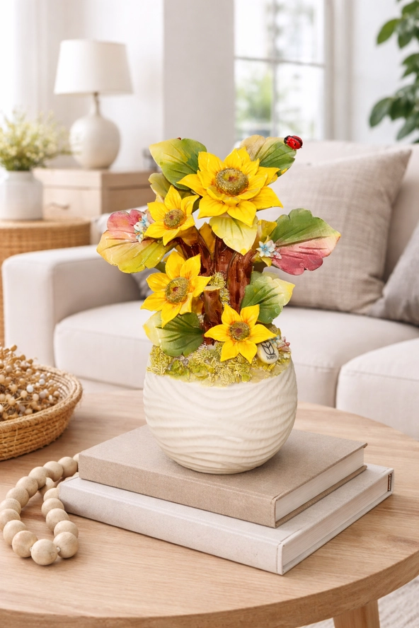 Włoska ceramika dekoracyjna LUEM-ART - dekoracyjna roślina- SŁONECZNIK w ceramicznym wazonie Apodimonte z małym słonecznikiem, modelowanym i malowanym ręcznie. Realistyczne detale, rzeźbione płatki i starannie wykonane liście tworzą elegancki element dekoracyjny włoskiej sztuki. Inspirowane stylem Capodimonte wprost idealna do ożywienia wystroju Twojej kuchni i wprowadzenia koloru oraz włoskiego klimatu.