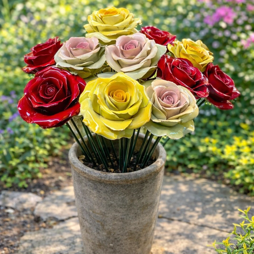 Włoska ceramika dekoracyjna LUEM-ART - dekoracyjny kwiatek w ilości = 10szt. - RÓŻA (sprzedawany bez doniczki/wazonu; w różnych kolorach/mix/, bez możliwości wyboru)