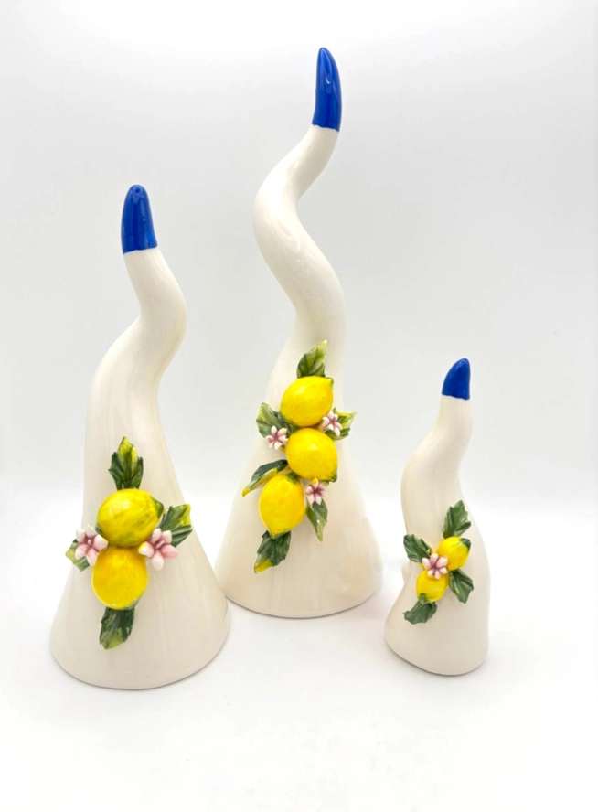 Elegancki, ozdobny róg z ceramiki Capodimonte, w całości wykonany ręcznie i wykończony farbami podszkliwnymi. Na falistej powierzchni znajduje się wyrafinowana aplikacja z cytryn, ręcznie wykonanych i malowanych, z liśćmi i drobnymi kwiatowymi detalami, które podkreślają kunszt wykonania.