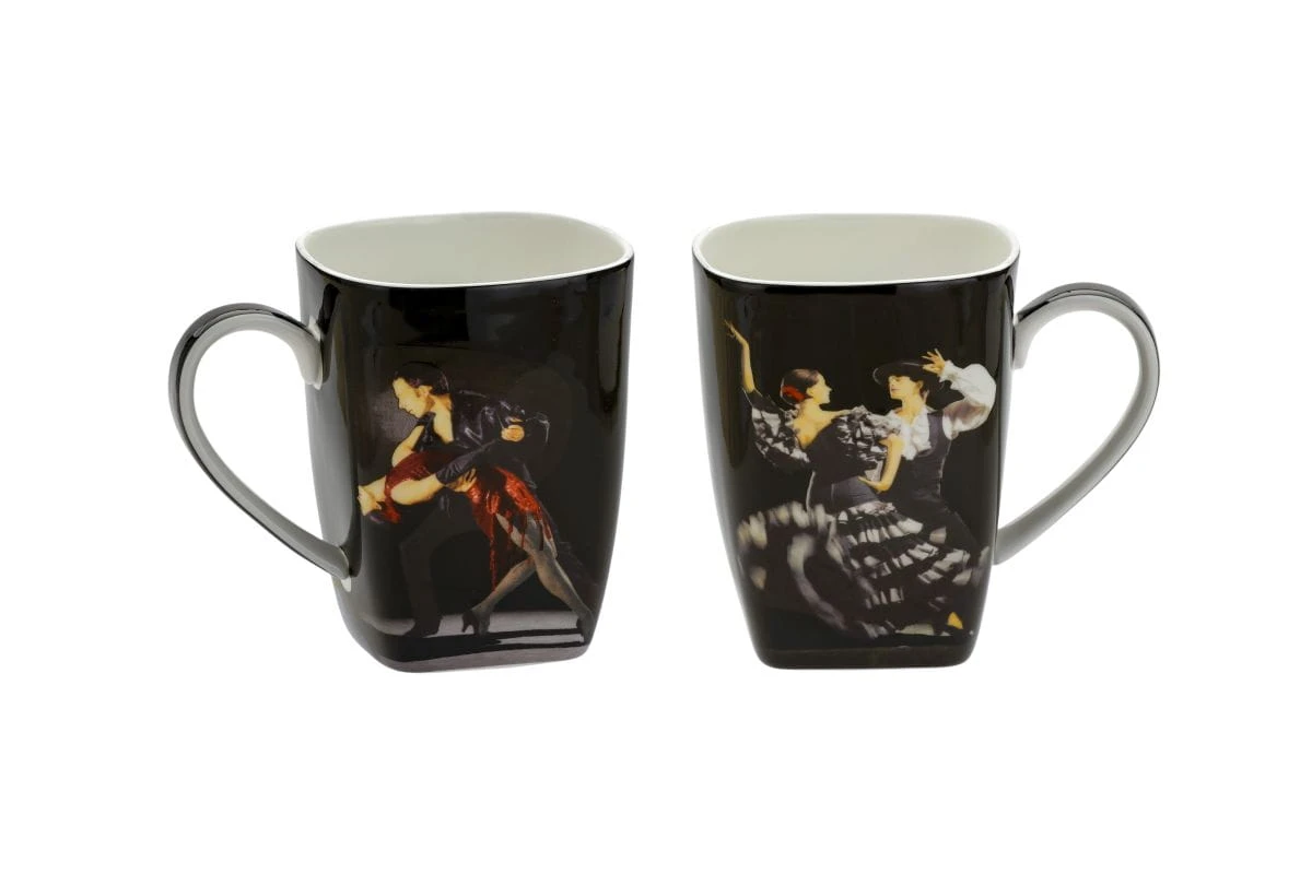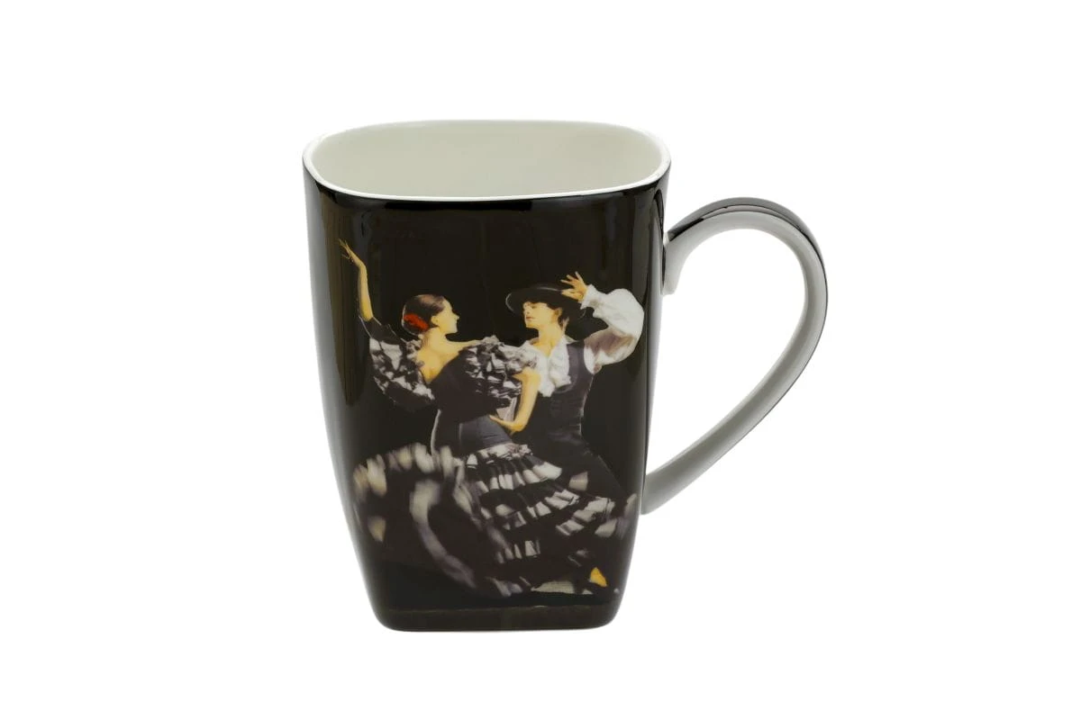 Oto kubek TANIEC z bardzo dobrej jakości porcelany z naniesionym, obustronnie innym, wyraźnym kolorystycznie motywem motywem przedstawiającym tańczące pary.