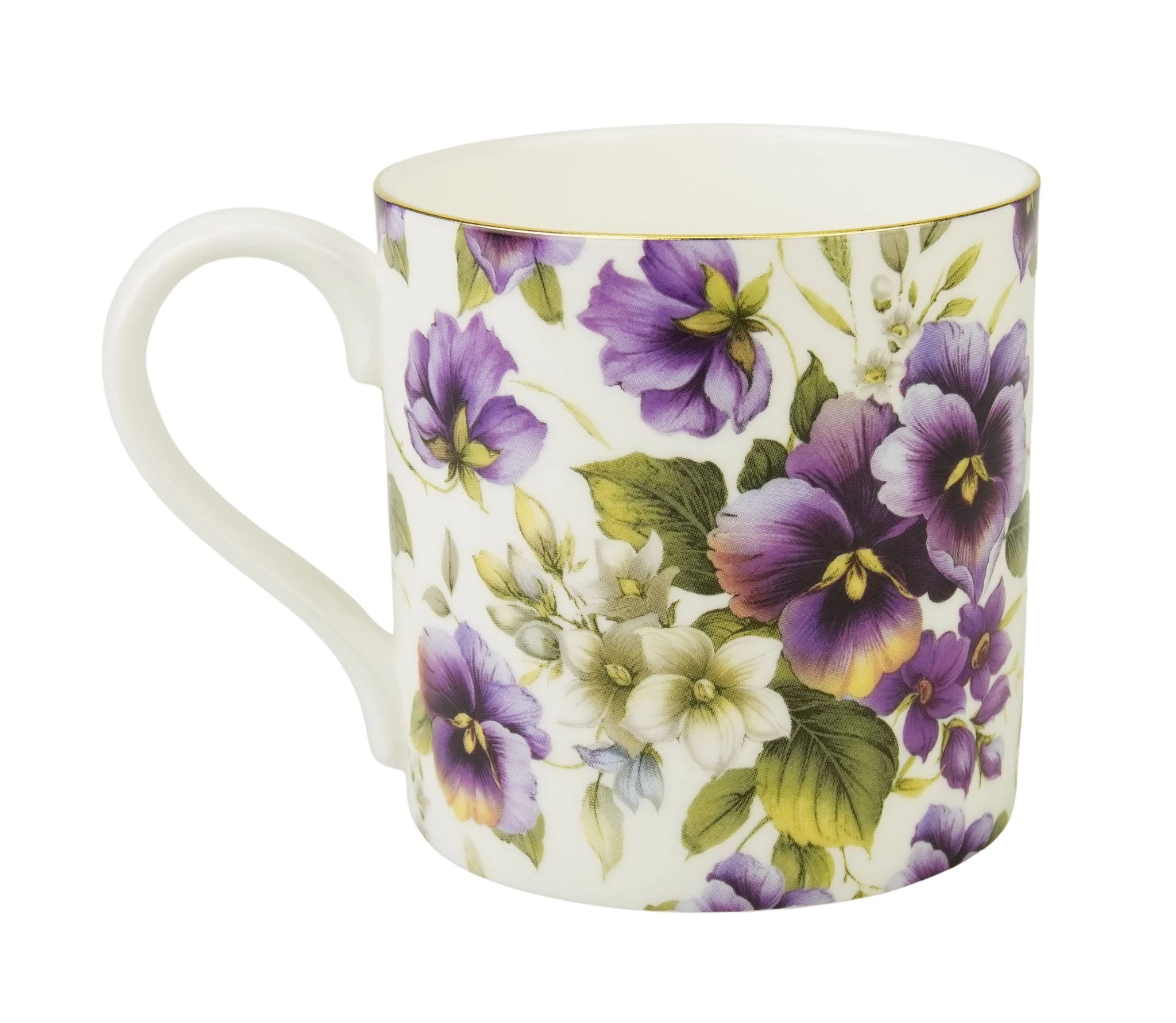 O prostym kształcie, poręczny kubek 350ml o bardzo ładnym motywie w bratki z delikatnymi złoceniami obrzeży.