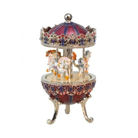 Piękna karuzela w kolorze bordowym, fioletowym i srebrnym ozdobiona małymi czerwonymi i niebieskimi cyrkoniami oraz srebrnymi ozdobami. Karuzela jest wyposażona w trzy konie karuzelowe.