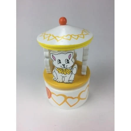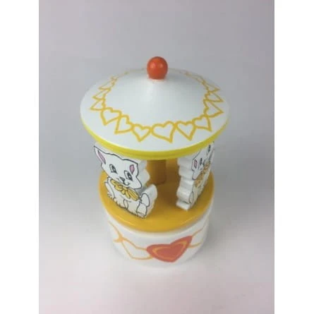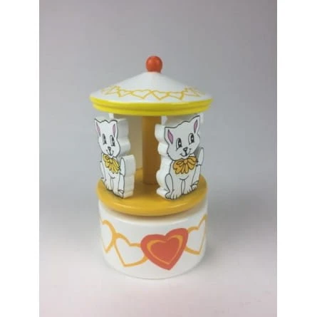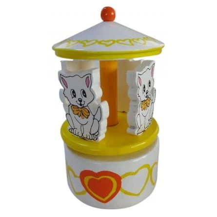 Mała, pięknie pomalowana drewniana karuzela wyposażona jest w cztery urocze drewniane koty. Jeśli obrócisz dach, mechanizm pozytywki zostanie nakręcony, a karuzela na podstawie obraca się w rytm dobrze znanej melodii.