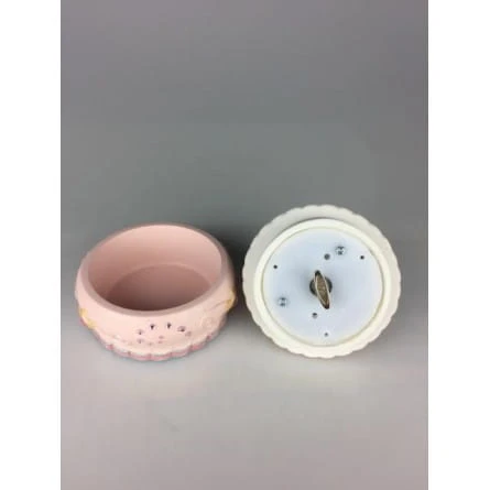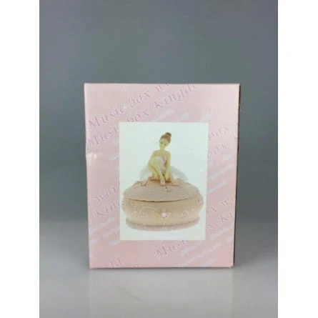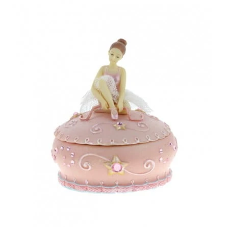 Różowa szkatułka na biżuterię z baletnicą wykonana z polystonu. Małe różowe pudełko na biżuterię zostało ozdobione małymi cyrkoniami i ozdobami. Mała baletnica siedzi rozmarzona na pokrywie i wiąże but.