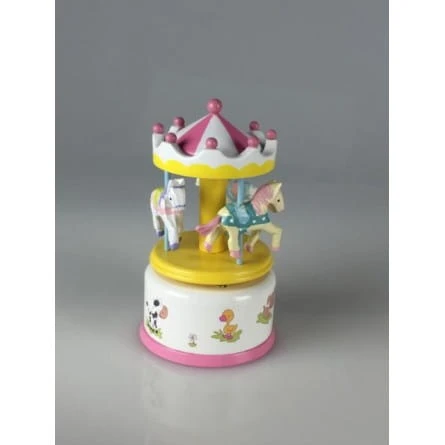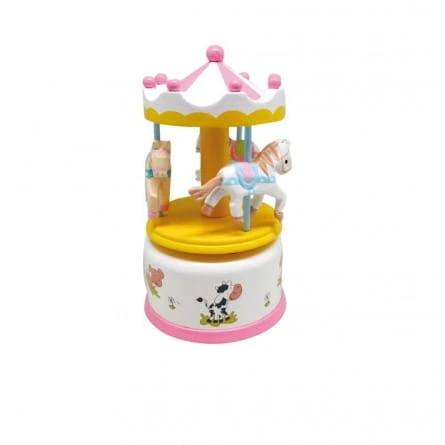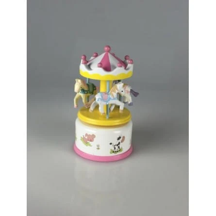 Drewniana karuzela w kolorze różowo-białym. Pięknie pomalowana drewniana karuzela jest wyposażona w 3 konie karuzelowe. Jeśli obrócisz dach, nakręcisz mechanizm, a karuzela na podstawie obraca się i rozbrzmiewa melodia „Für Elise”.