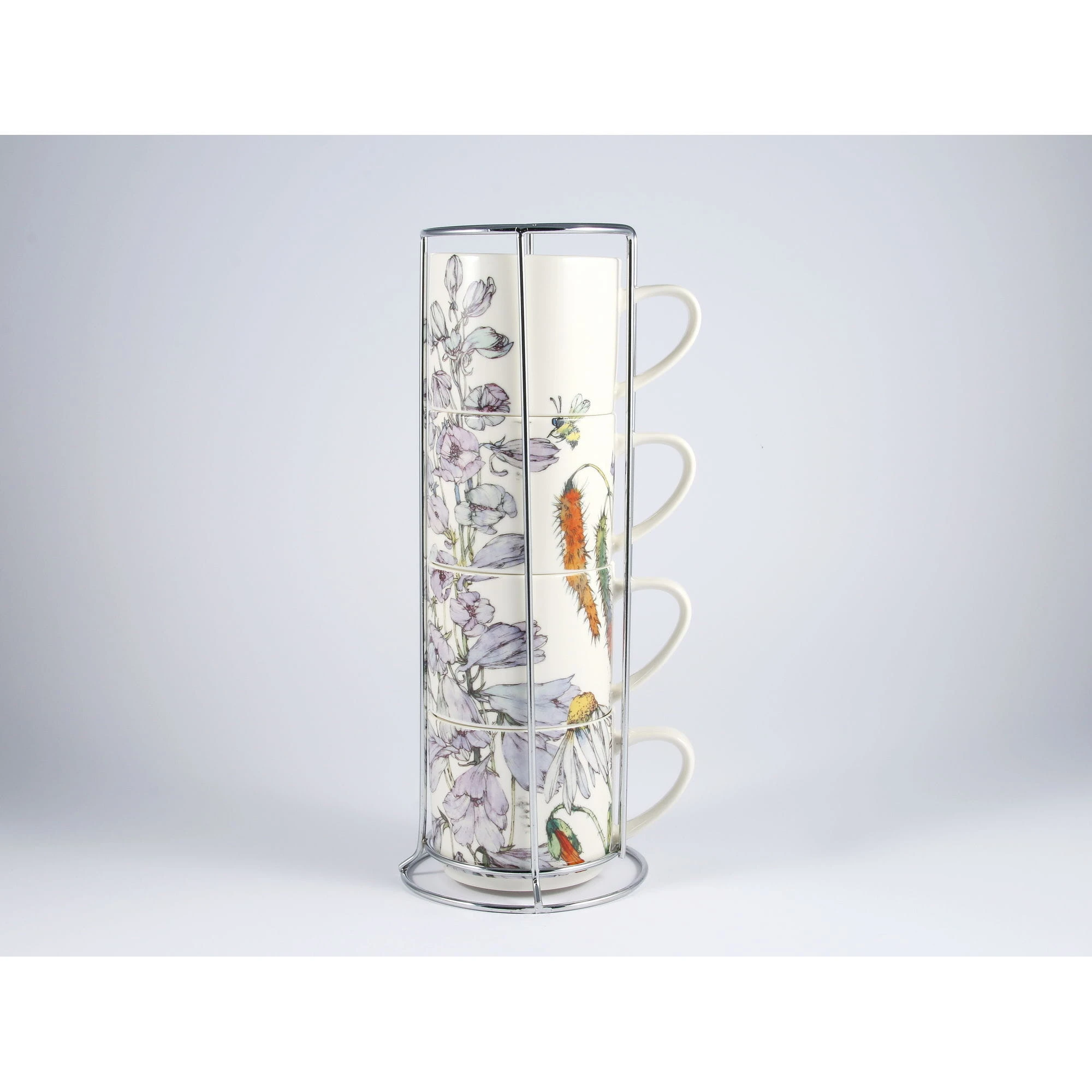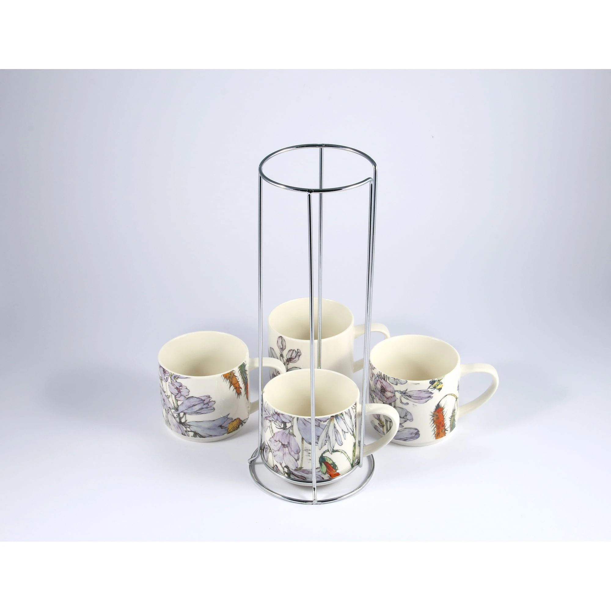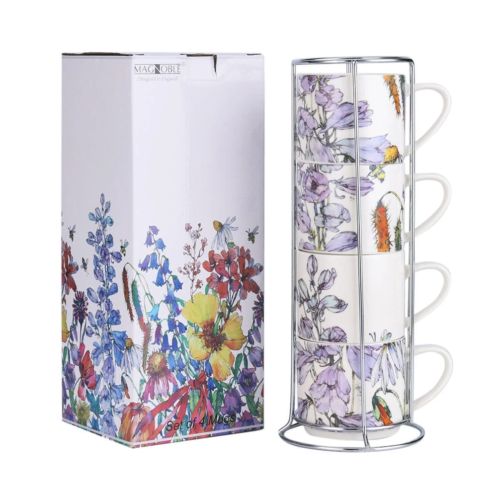 Komplet czterech kubków(330ml) z metalowym stojakiem do ich przechowywania firmowany marką Magnoble, wchodzący w skład mini-kolekcji Wild Flower przedstawiającej kolorowe, polne kwiaty.