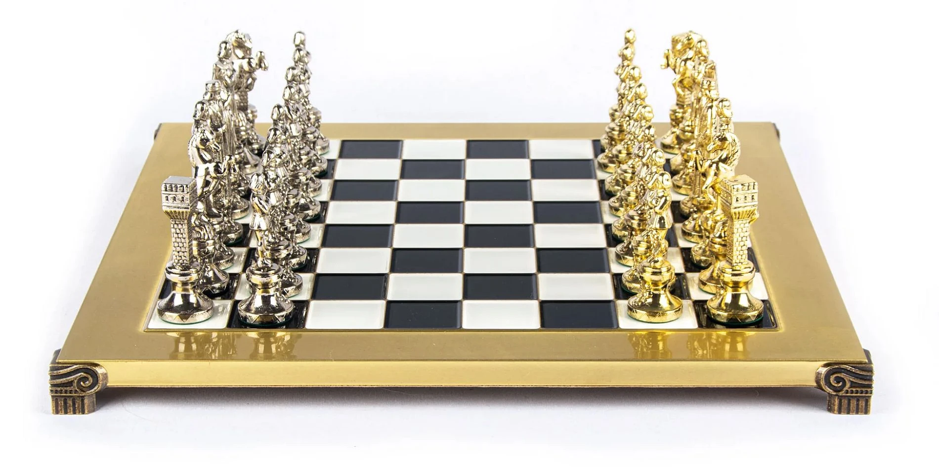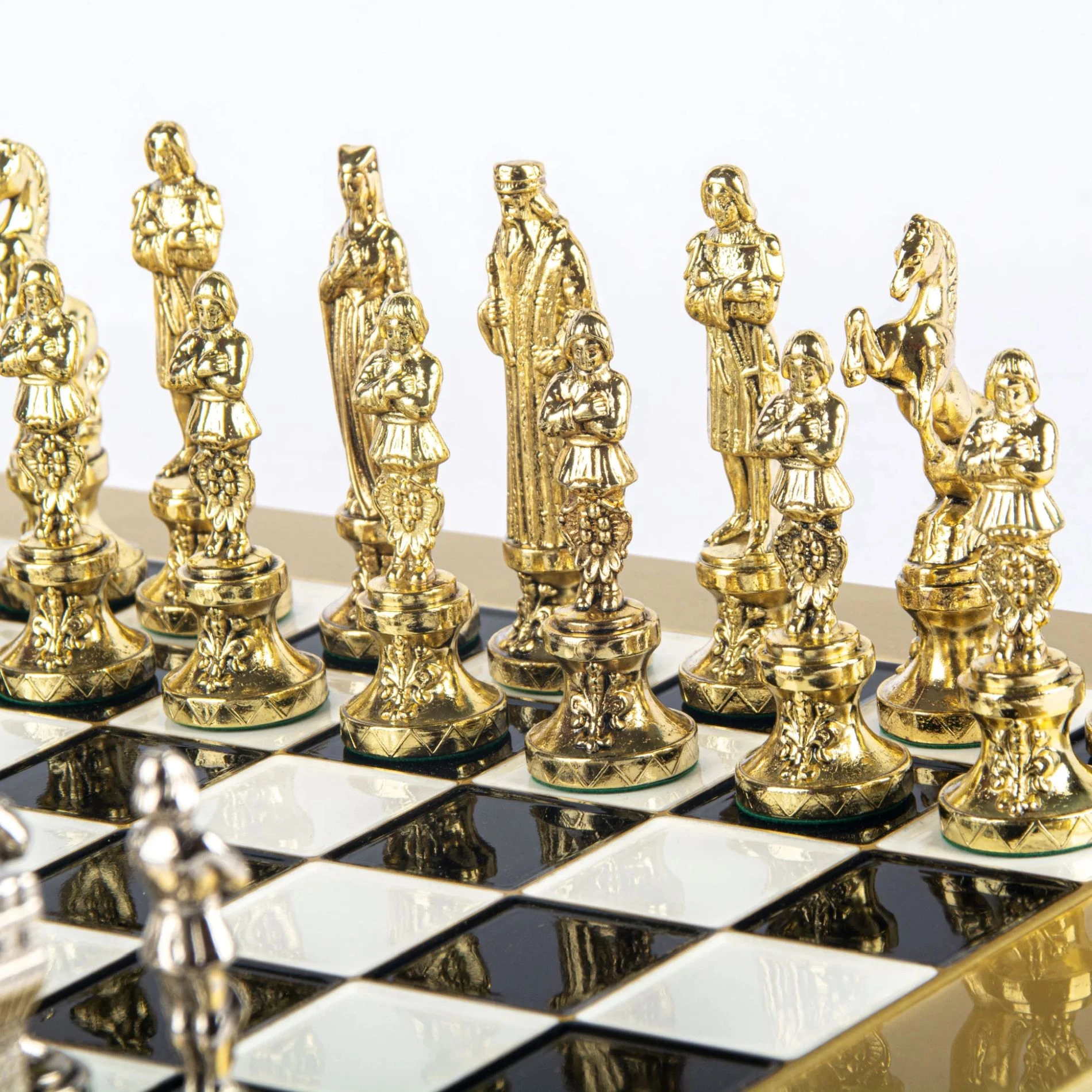 Atrakcyjny, średniej wielkości komplet szachów z metalu Renaissance o zdobionej, wytłaczanej szachownicy 36x36cm greckiego koncernu Manopoulos, powstałego w 1970 roku produkującego zestawy gier towarzyskich z drewna oraz metalu.