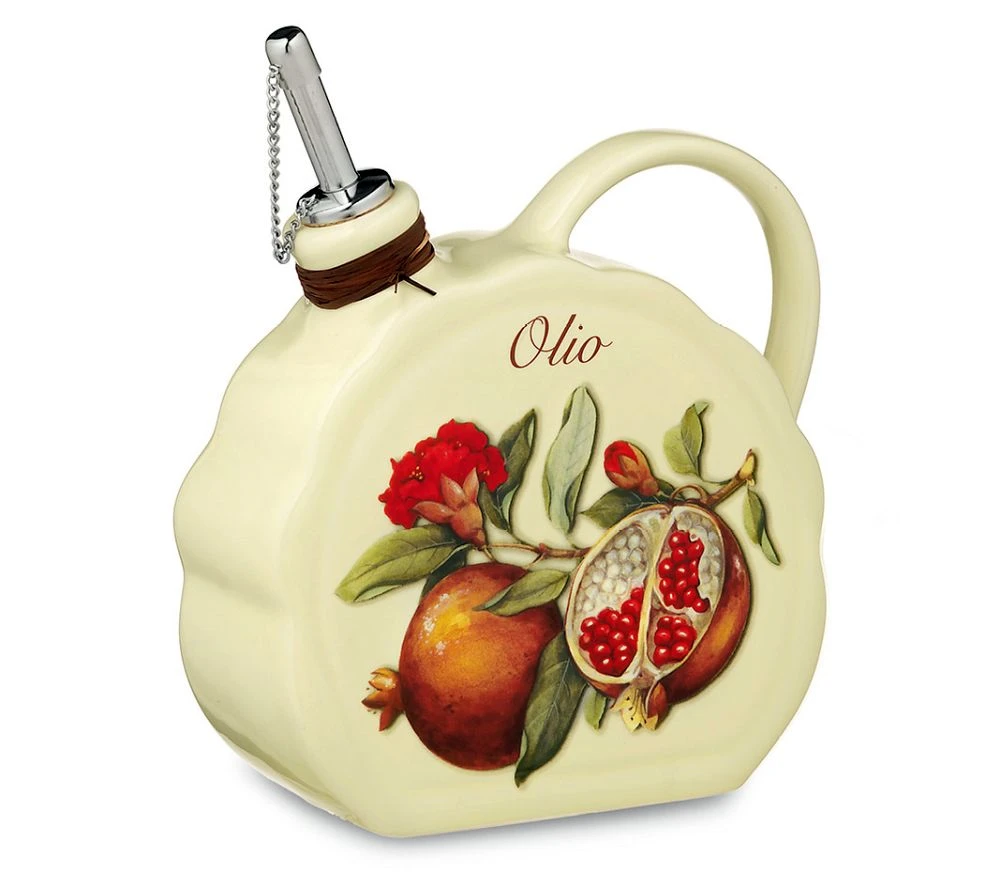 Ceramiczna butelka na olej z metalowym dziobkiem ułatwiającym nalewanie z kolekcji Melograno włoskiej manufaktury Nuova Cer. powstałego i istniejącego od 1992r. w Umbertide, małej wiosce w sercu zielonej Umbrii :)