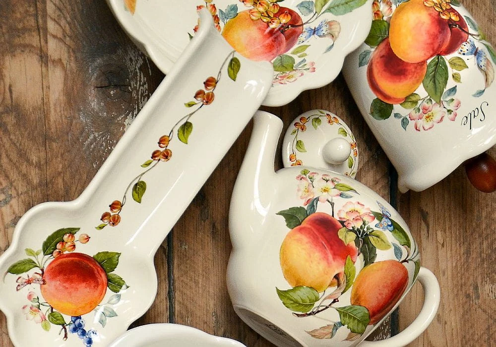 2. śliczny, wyraźny motyw przedstawiający przede wszystkim brzoskwinie w kolorach słońca z uzupełnieniem motywu(w zależności od produktu) motylkami, owocami białych porzeczek lub jagód oraz kwiatami kwitnącego drzewa-brzoskwinii