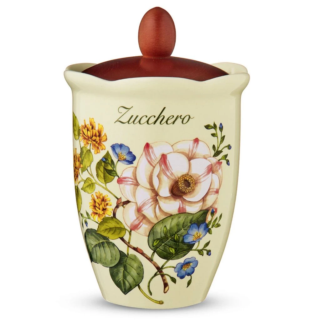 Ceramiczny pojemnik na cukier o wysokości = około 20,5cm z drewnianą, szczelną przykrywką z kolekcji Royal Garden (królewski ogród) włoskiej manufaktury Nuova Cer. powstałego i istniejącego od 1992r. w Umbertide, małej wiosce w sercu zielonej Umbrii :)