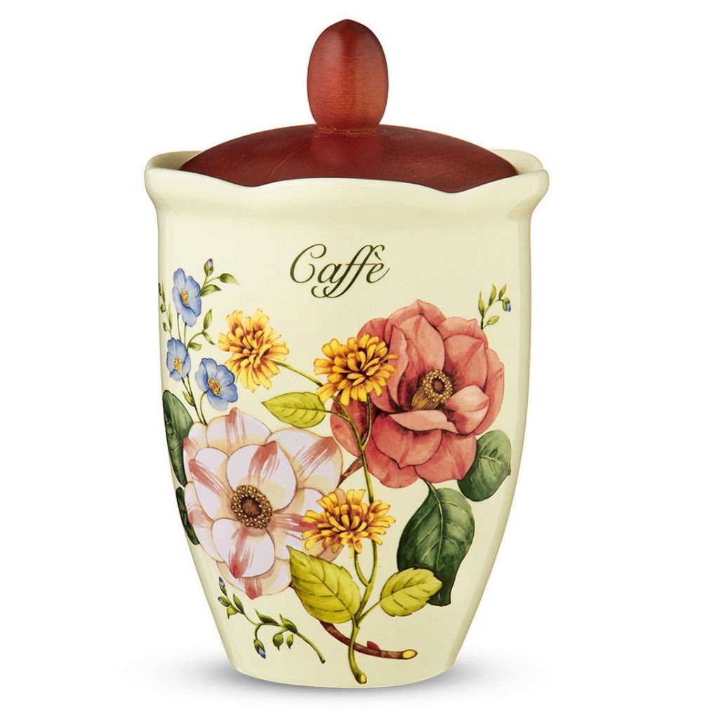 Ceramiczny pojemnik na kawę o wysokości = około 20,5cm z drewnianą, szczelną przykrywką z kolekcji Royal Garden (królewski ogród) włoskiej manufaktury Nuova Cer. powstałego i istniejącego od 1992r. w Umbertide, małej wiosce w sercu zielonej Umbrii :)
