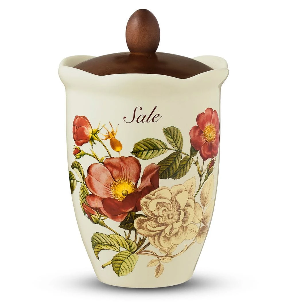 Ceramiczny pojemnik na sól o wysokości = około 20,5cm z drewnianą, szczelną przykrywką z kolekcji Regale Roses (królewskie róże) włoskiej manufaktury Nuova Cer. powstałego i istniejącego od 1965 roku(pod tą nazwą od 1992r.) w Umbertide, małej wiosce w sercu zielonej Umbrii :)