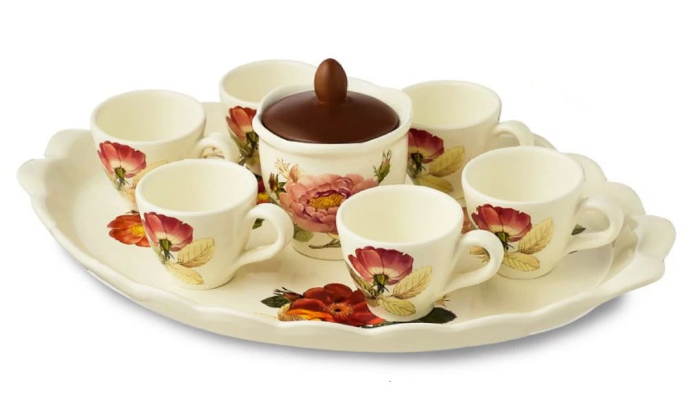 ...ceramiczny, 8-elementowy zestaw do kawy-espresso składający się z: owalnej tacy; sześciu, małych filiżanek oraz cukierniczki z drewnianą przykrywką.