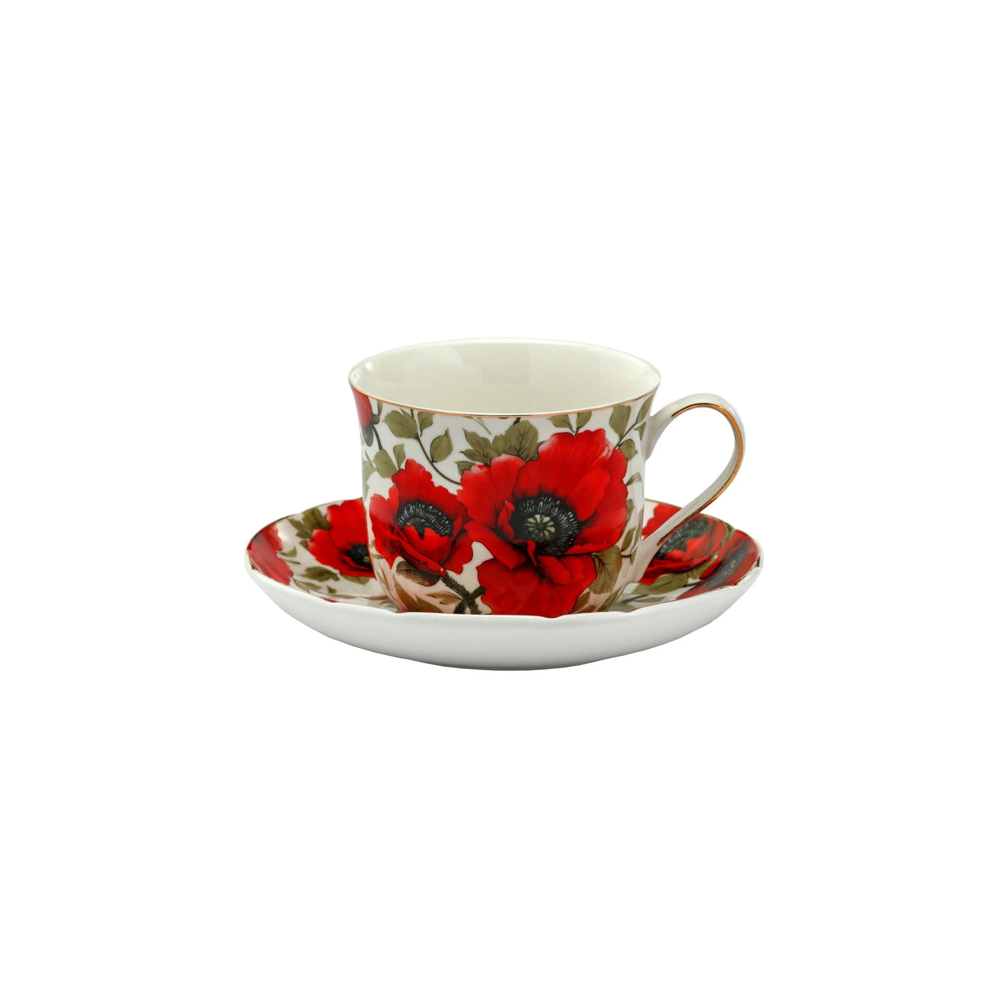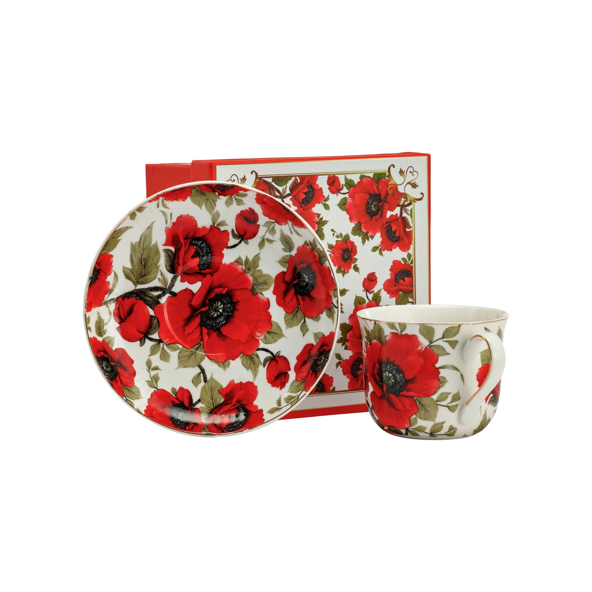 Duża(około 400ml), ale poręczna filiżanka śniadaniowa o tradycyjnym kształcie z ładnym, kwiatowym motywem przedstawiającym intensywnie czerwone maki i z naniesionymi delikatnymi złoceniami obrzeży.