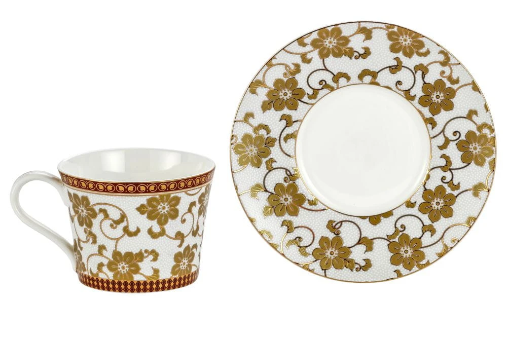 Wykonana z bardzo dobrej jakości kostnej porcelany filiżanka ze spodeczkiem o oryginalnym/atrakcyjnym wizualnie i wyczuwalnym pod palcem motywie z perfekcyjnymi zdobieniami wykonanymi 24k złotem.