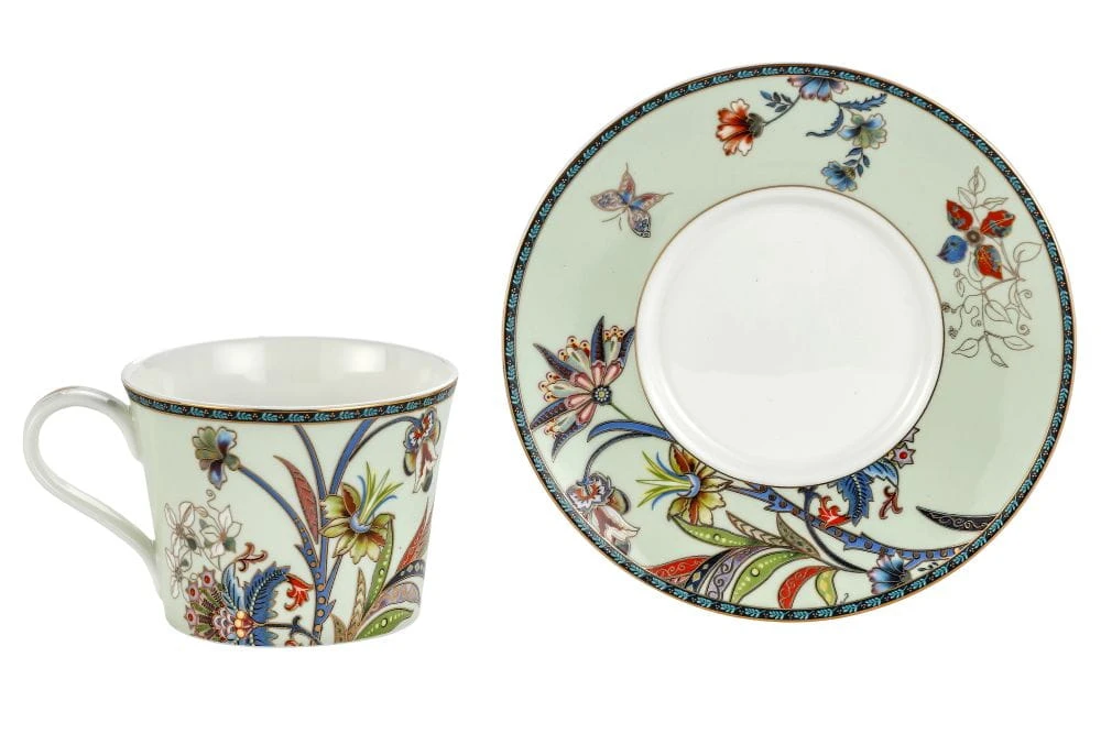 Wykonana z bardzo dobrej jakości kostnej porcelany filiżanka ze spodeczkiem o oryginalnym/atrakcyjnym wizualnie motywie kwiatowym z perfekcyjnymi zdobieniami wykonanymi 24k złotem.