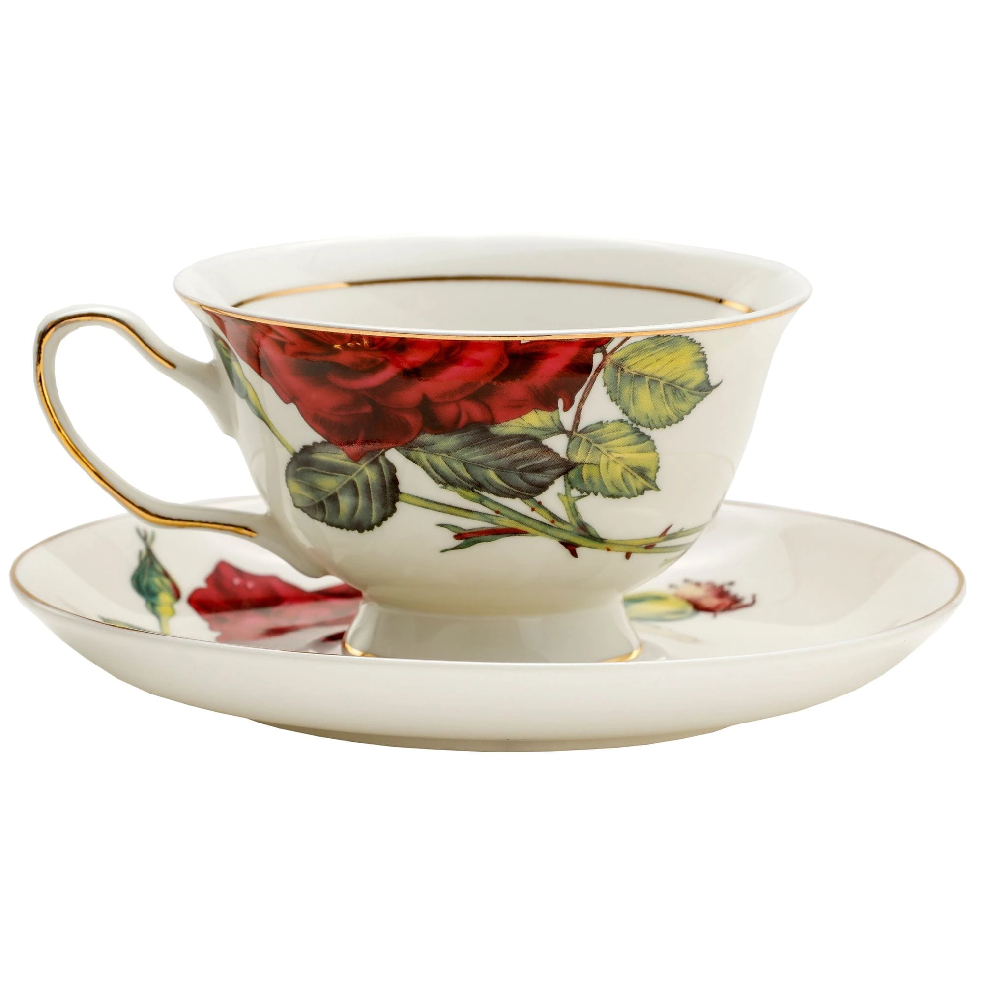 Tradycyjna filiżanka do herbaty Red Rose(czerwona róża) ze spodeczkiem wykonana z dobrej jakości porcelany kostnej t. "Fine Bone China" o ładnym motywie przedstawiającym różę na białym tle, z delikatnymi złoceniami obrzeży filiżanki oraz spodeczka.
