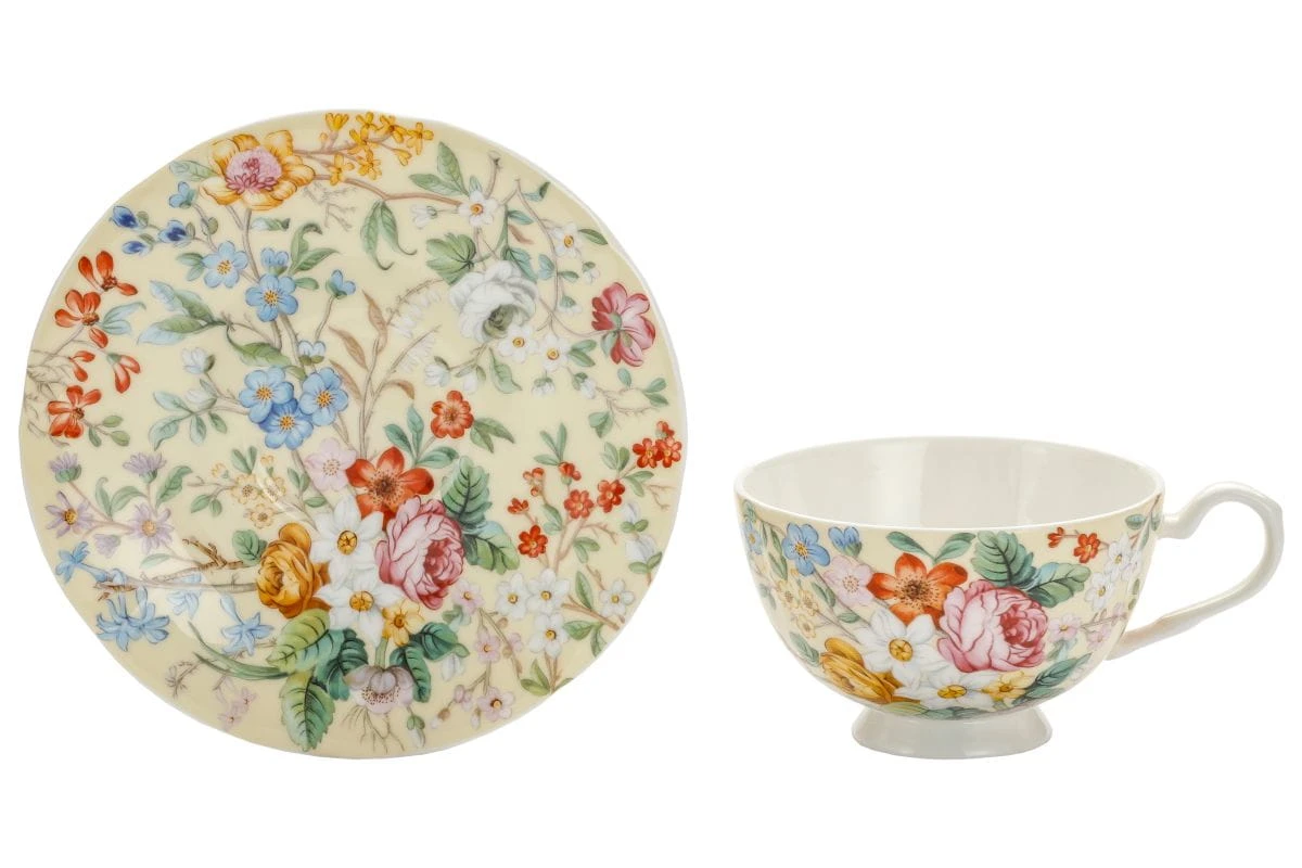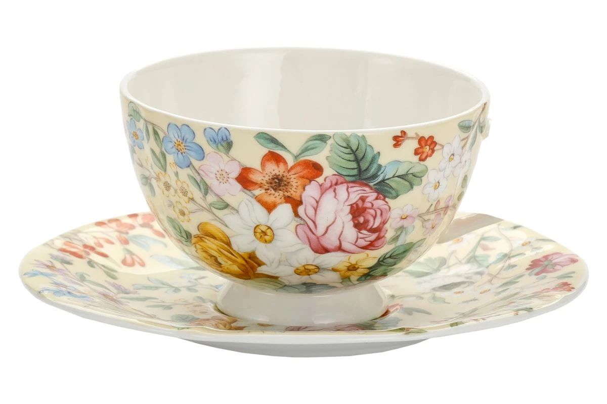 Motyw, który zdobi tą filiżankę (a także inne filiżanki, kubki, itp.), to mistrzowska kompozycja barwnych kwiatów – od róż, przez narcyzy, po delikatne niebieskie i lawendowe akcenty. Każdy szczegół został dopracowany z niezwykłą precyzją, tworząc wrażenie ręcznie malowanego bukietu zamkniętego w porcelanie.