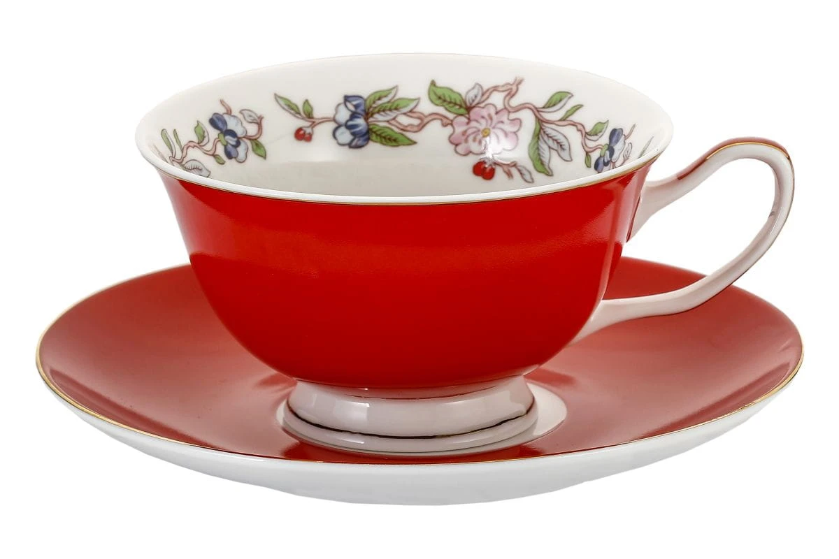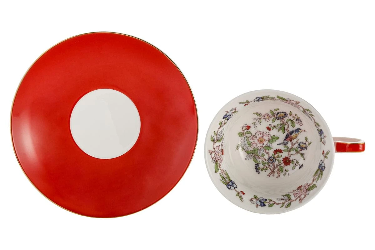 O tradycyjnym kształcie filiżanka do herbaty lub/i cappuccino Flowers(czerwona wersja kolorystyczna) ze spodeczkiem z niespotykanym zdobionym dnem filiżanki wykonana z dobrej jakości porcelany kostnej t. "Fine Bone China" o ładnym motywie kwiatowym, intensywnym kolorystycznie z dodatkami zdobień obrzeży wykonanych 18k złotem.
