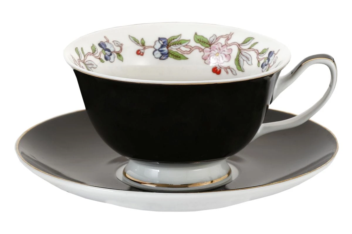 O tradycyjnym kształcie filiżanka do herbaty lub/i cappuccino Flowers(czarna wersja kolorystyczna) ze spodeczkiem z niespotykanym zdobionym dnem filiżanki wykonana z dobrej jakości porcelany kostnej t. "Fine Bone China" o ładnym motywie kwiatowym, intensywnym kolorystycznie z dodatkami zdobień obrzeży wykonanych 18k złotem.
