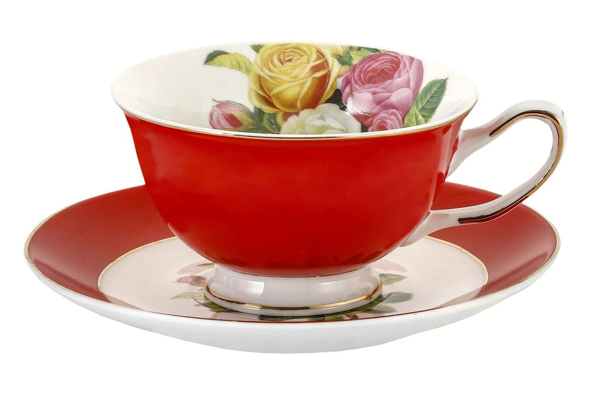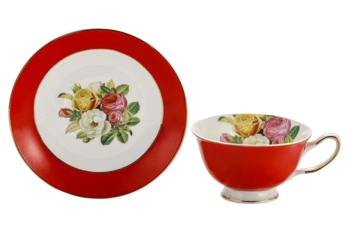 Tradycyjna filiżanka do herbaty Roses(czerwona wersja kolorystyczna) ze spodeczkiem wykonana z dobrej jakości porcelany kostnej t. "Fine Bone China" o ładnym, nietypowym motywie kwiatowym, intensywnym kolorystycznie z dodatkami zdobień obrzeży wykonanych 18k złotem.