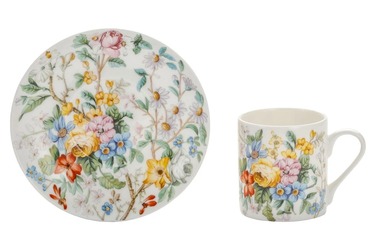Motyw, który zdobi tą filiżankę (a także inne filiżanki, kubki, itp.), to mistrzowska kompozycja barwnych kwiatów – od róż, przez narcyzy, po delikatne niebieskie i lawendowe akcenty. Każdy szczegół został dopracowany z niezwykłą precyzją, tworząc wrażenie ręcznie malowanego bukietu zamkniętego w porcelanie.